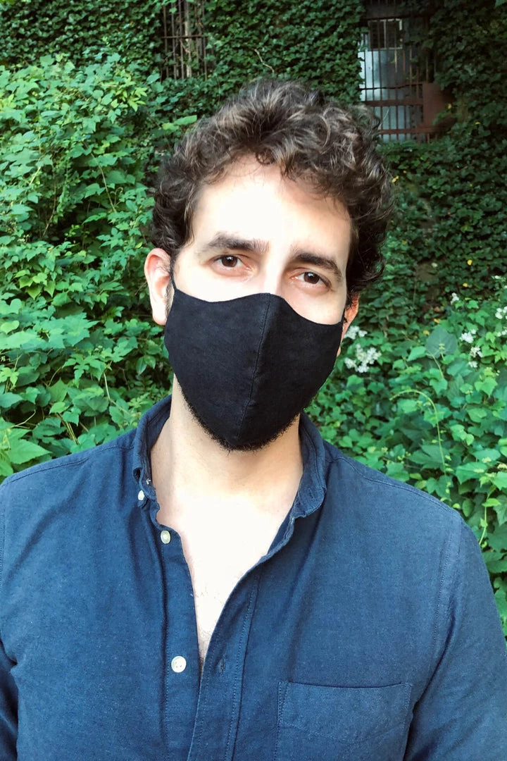 Our standard size mask fits women and men with small to average head sizes and comes with adjustable ear loops, plus a built-in metal nose wire to improve the fit and help prevent glasses from fogging. It’s made with two layers of tightly-woven 100% cotton and includes a filter pocket with a washable filter, made of German recycled polyester (OEKO-TEX® Certified). You can see a video of our model Natalia at home wearing our sapphire blue mask