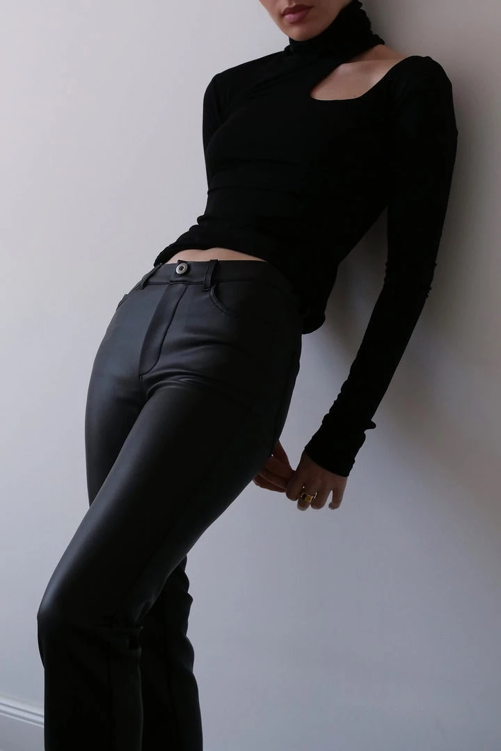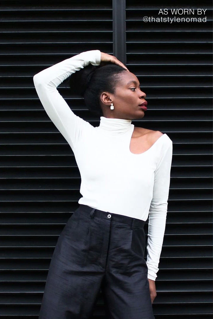 Take the plunge in our unique cut turtleneck, Allegra. The perfect top for a night out, she reveals the right amount of skin for an edgy look. Extra long sleeves and a beautiful turtleneck balance out the stunning cut-out on your left shoulder. Fashioned from our beloved sustainable European jersey for stretch and softness. [SPLIT]