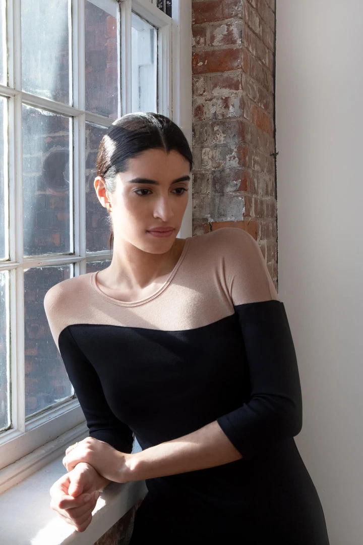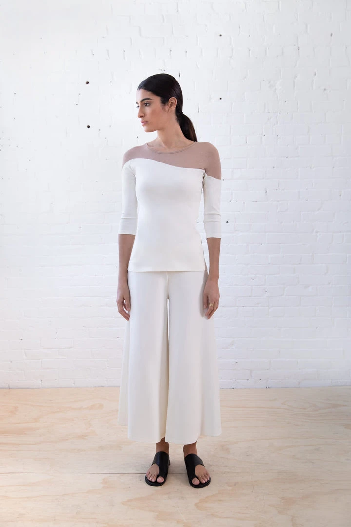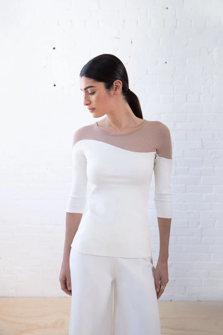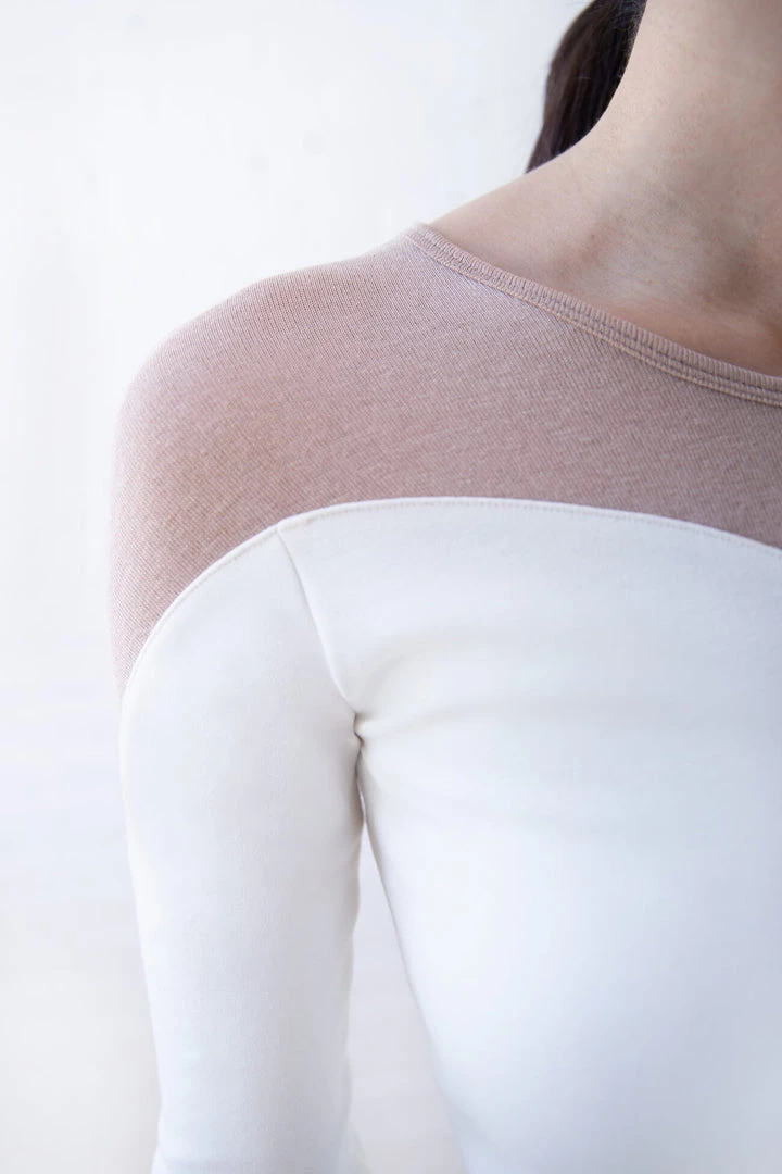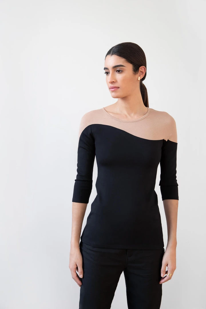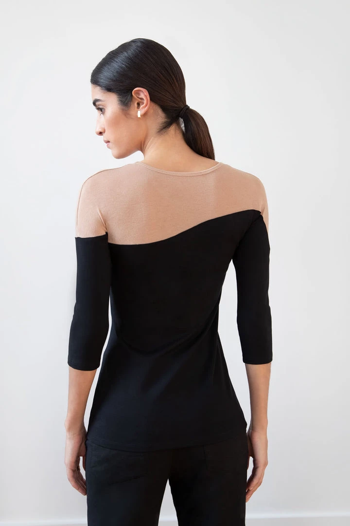 Bring understated elegance to your everyday street style with this two-toned, lightweight blouse. This new classic features a curved, sheer jersey panel that extends from the shoulder line to the upper chest, and casual, elbow-length sleeves. Crafted with our premium jersey fabric, this top hugs the body beautifully and pairs well with just about anything your heart desires. [SPLIT]