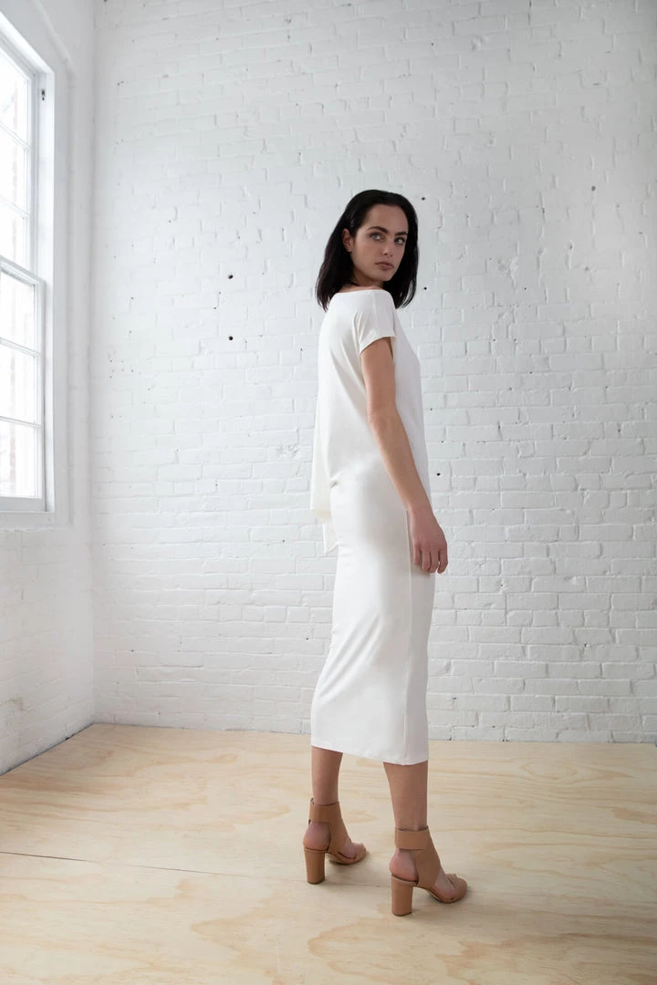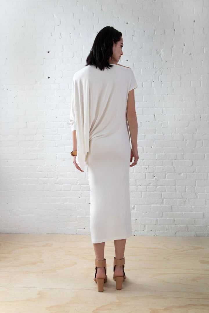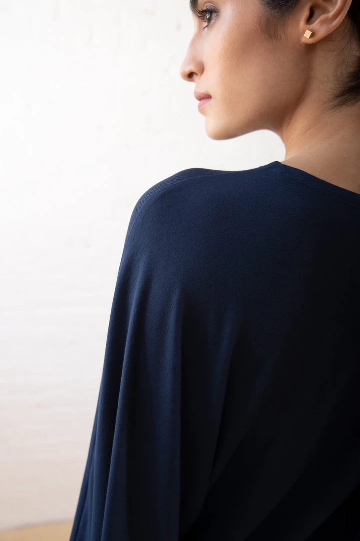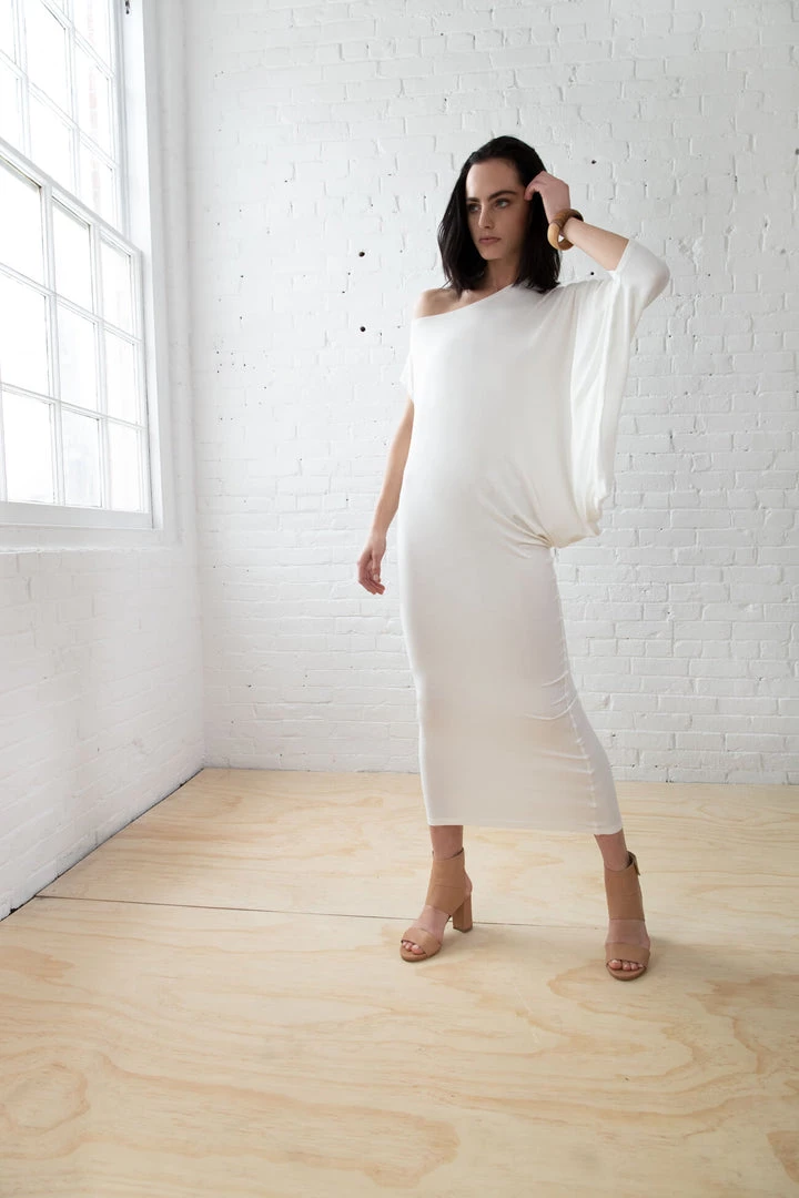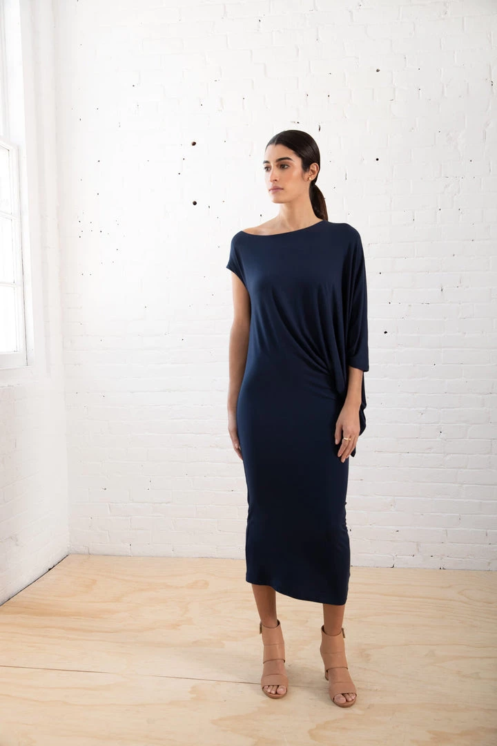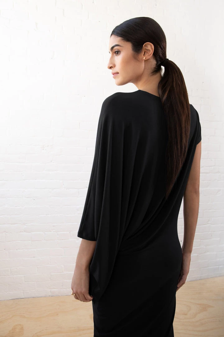 This statement sleeve dress is sure to attract all eyes on you. Andrea is an asymmetric shift dress with a standout silhouette. Make every movement and pose a little bit more striking with the hybrid batwing-and-cuffed sleeve. Made with silky European jersey with just the right amount of stretch.[SPLIT]