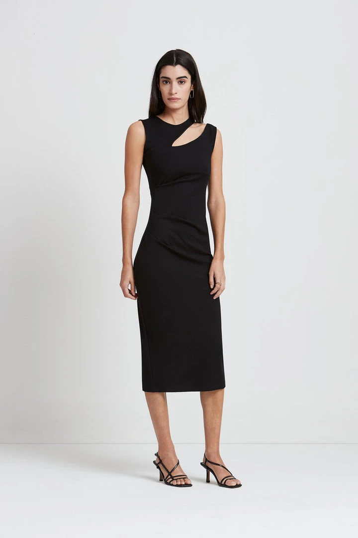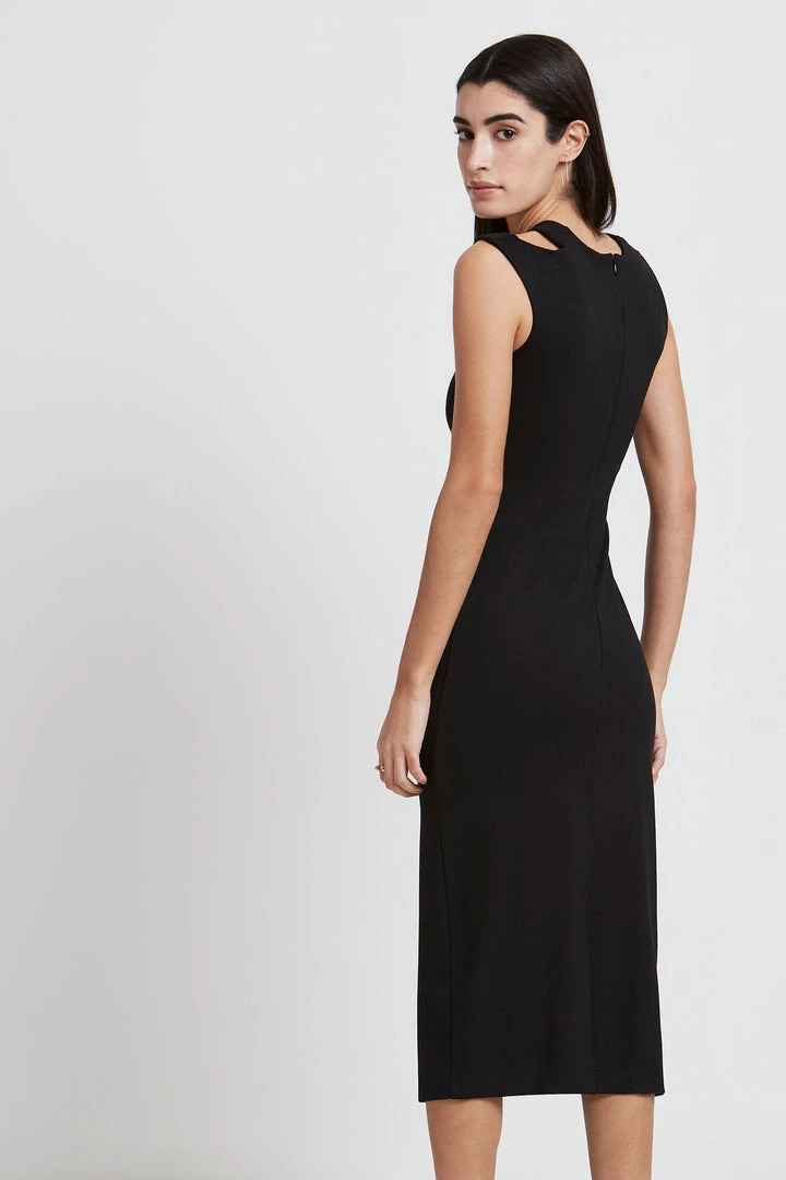 Cocktails, anyone? We’ve proudly reimagined the party dress as a streamlined-yet-edgy classic: the Astor. She’s a sleeveless midi featuring a cutout that slants across the chest, creating a unique neckline with a strappy feel. Fashioned from our soft, mid-stretch European ponte, Astor offers a structured fit with a gathering along the right waist for an elevated, slimming silhouette. [SPLIT]