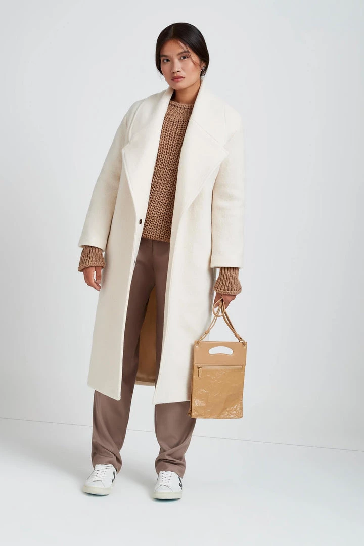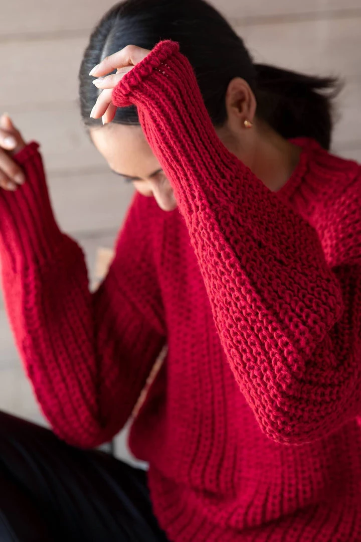 Meet your new favorite classic, the Audrey Sweater. Knit from our devastatingly soft French Merino wool-blend yarn and featuring a looser weave with just the right amount of chunky. Audrey has a roomy fit, dropped shoulders, and long, beautiful balloon sleeves finished with a thick ribbed cuff. She comes in quintessential Marcella neutrals plus three limited-edition shades—Camel, Olive, and Berry Red. At Marcella – advocates as we are for smaller capsule wardrobes – we wouldn’t blame you for grabbing more than one color of Audrey! [SPLIT]
