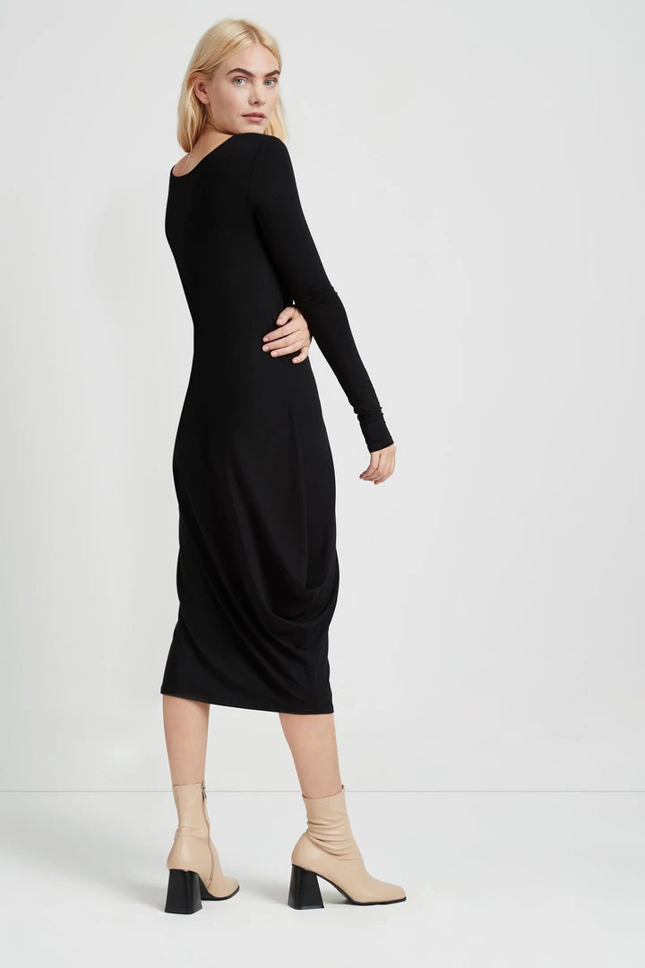 Consider our Aventura Dress your new day-to-night LBD essential. Designed to fall below the knee with a graceful asymmetrical drape detail, she features a scoop neckline and our signature extra-long sleeves. Crafted from our silky soft, high-stretch European jersey (eco-friendly), Aventura is effortless to dress up or down.[SPLIT]