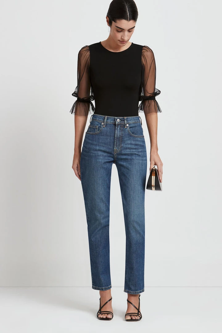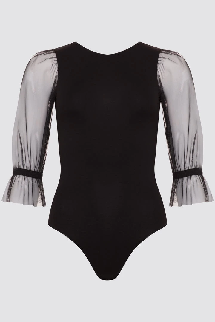 Laced with romance, the Bellerose Bodysuit is fashioned from our high-stretch European Jersey to create a slimming round-neck bodice and married with buttery mesh for the prettiest mid-length poet sleeves. Wear her with jeans and sandals for a dreamy daytime look or style her for after hours with tailored trousers and a strappy heel.