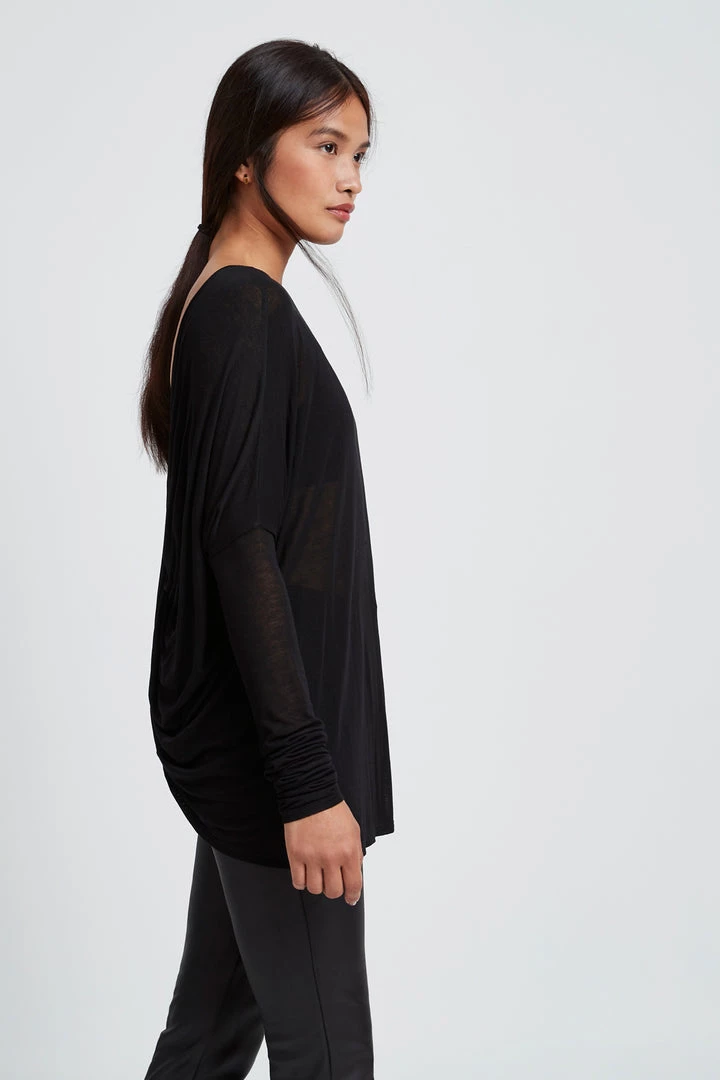 Two stunning tops in one—meet our Waldorf. Wear her forwards or backwards -your choice – depending on how you wish to feature her dramatic drape and make use of her easy versatility. Waldorf’s cut from our silky soft, high-stretch sheer European jersey. Janine wears Waldorf with the accent in back in her first pic and with the accent in front in the second pic. However you choose to wear her, you’ll be sure to turn heads.[SPLIT]