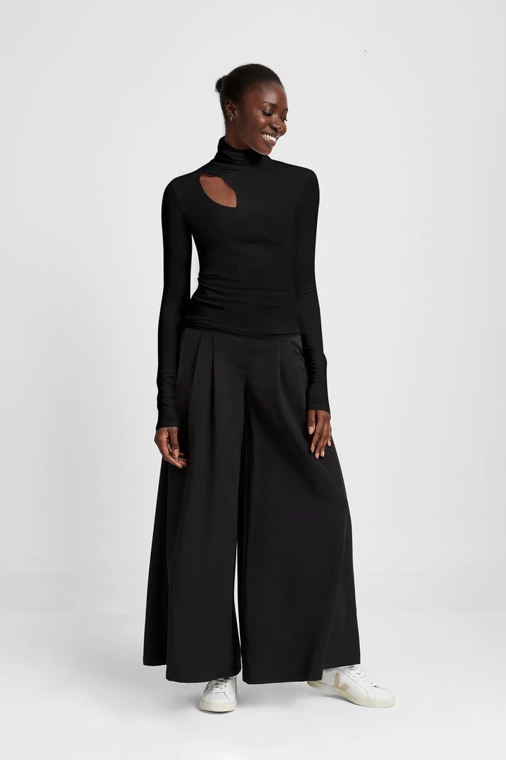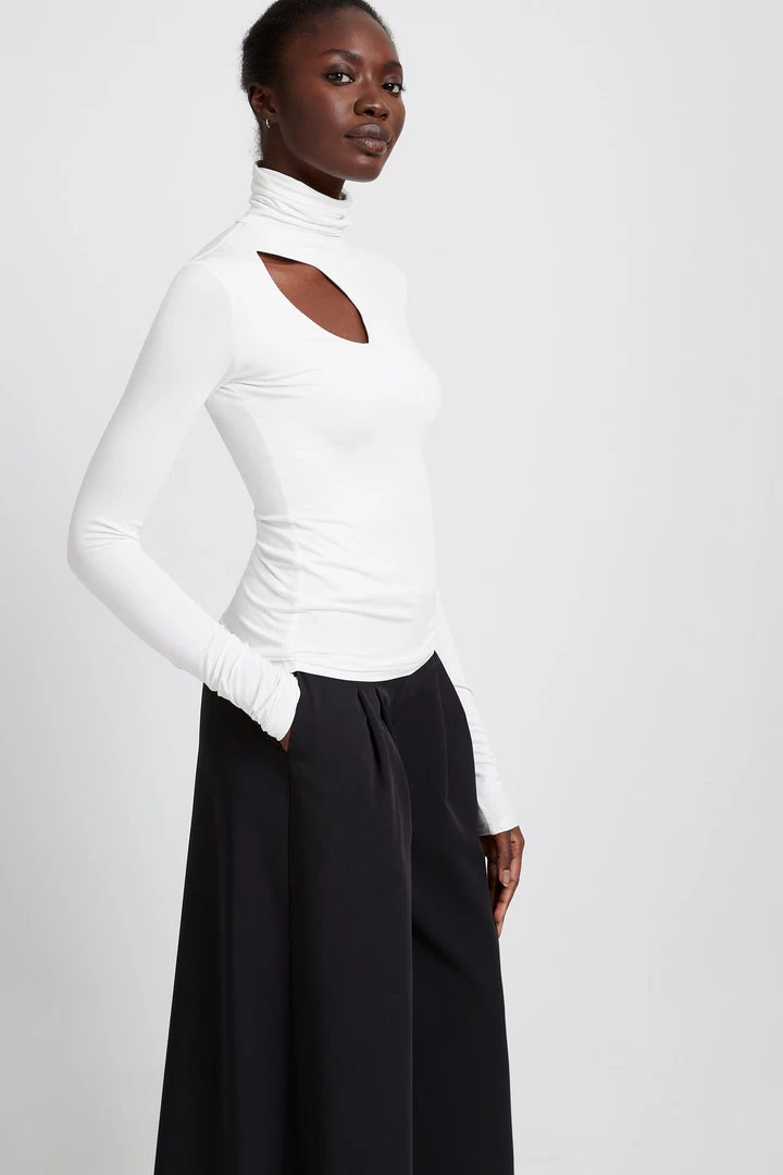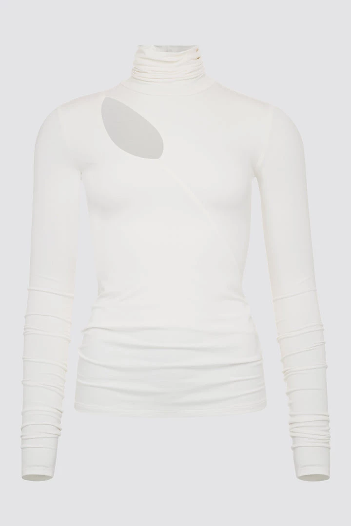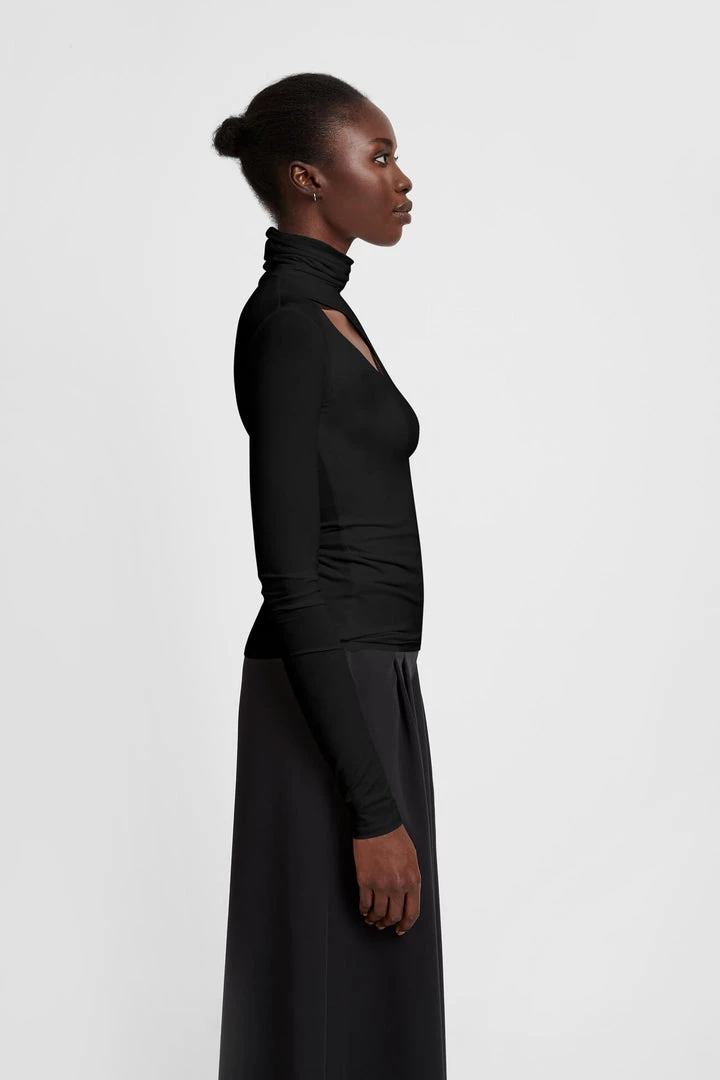 THE top to wear during changing temps, our Bryant features an alluring cutout on the collarbone that wows on its own or reveals beautifully once you shrug off your trench. Crafted from our soft, high-stretch and sustainable European jersey, she layers effortlessly and smoothens out your figure. Style her with a belt, frayed jeans and square toe boots.[SPLIT]