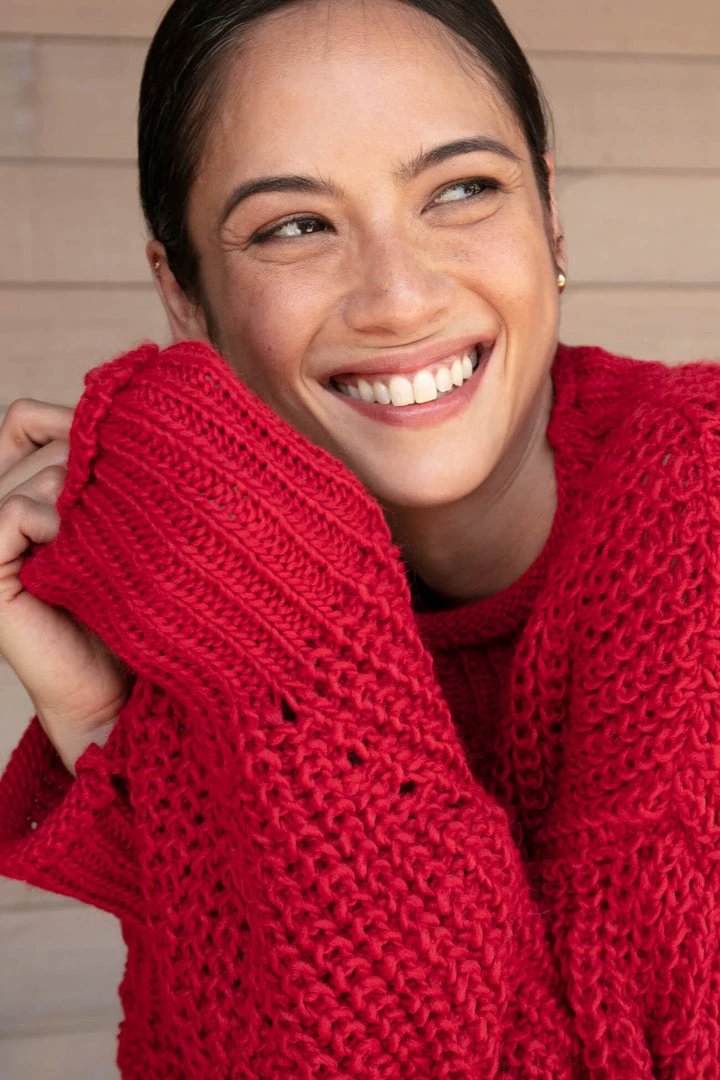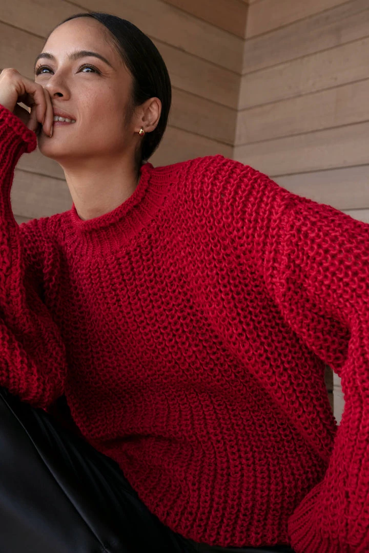 Meet your new favorite classic, the Audrey Sweater. Knit from our devastatingly soft French Merino wool-blend yarn and featuring a looser weave with just the right amount of chunky. Audrey has a roomy fit, dropped shoulders, and long, beautiful balloon sleeves finished with a thick ribbed cuff. She comes in quintessential Marcella neutrals plus three limited-edition shades—Camel, Olive, and Berry Red. At Marcella – advocates as we are for smaller capsule wardrobes – we wouldn’t blame you for grabbing more than one color of Audrey![SPLIT]