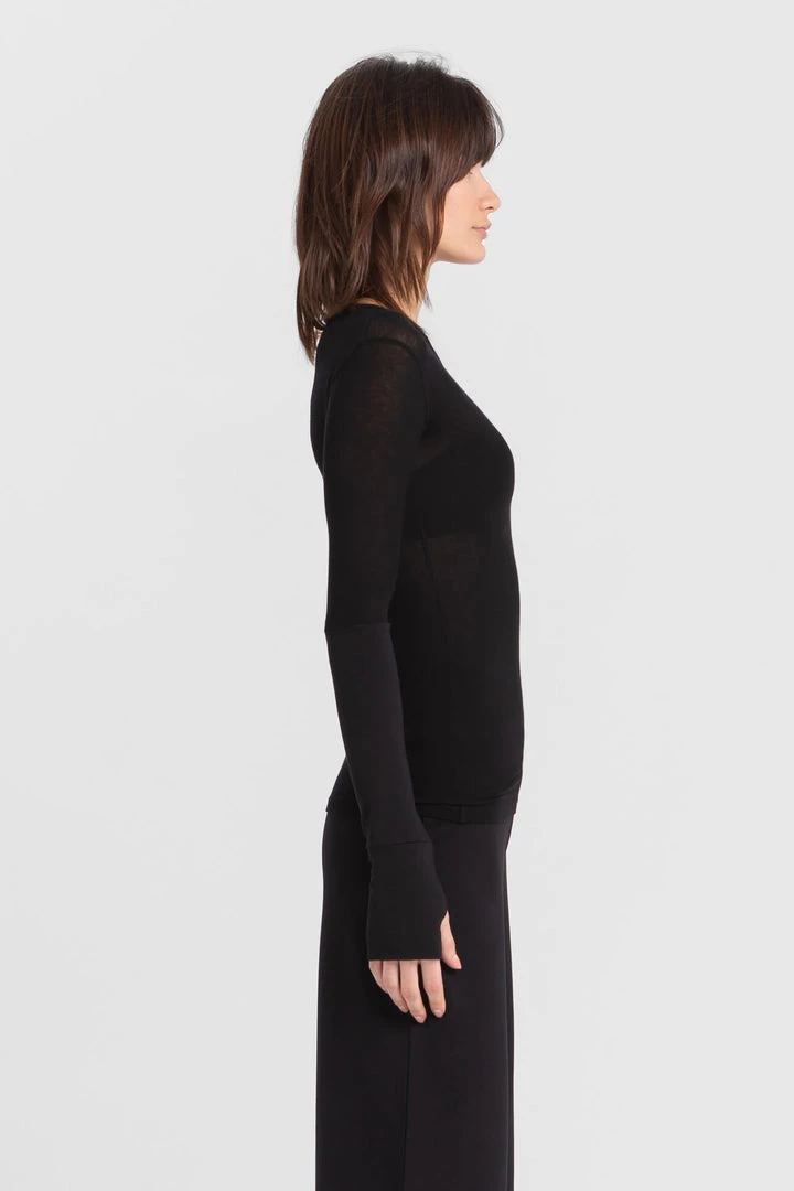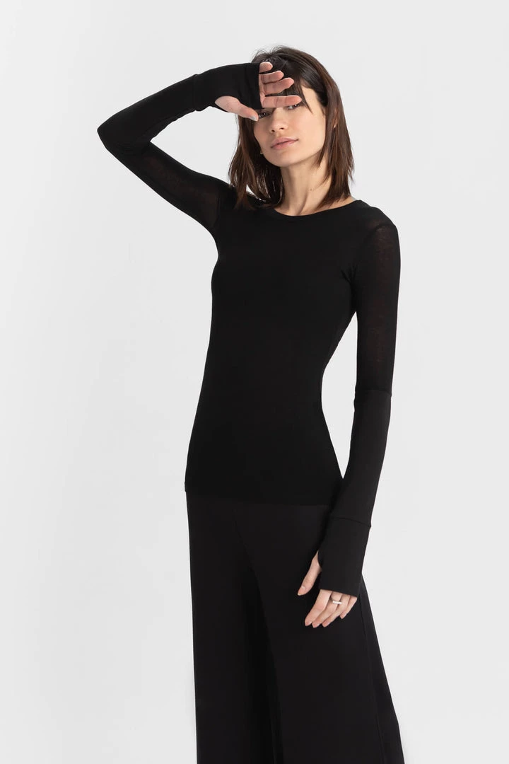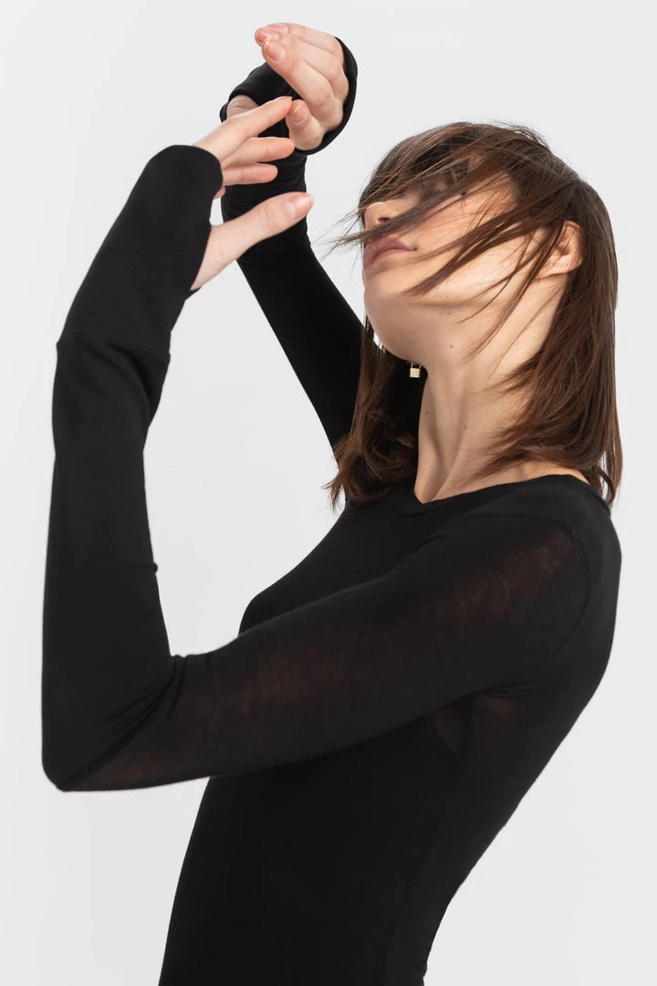 Minimal and refined, our Carmen is your capsule canvas, an endlessly versatile top. Fashioned from silky, stretchy European sheer jersey, she offers a smooth fit and supreme comfort. Thumbholes add edge and pin the sleeves to your wrists. Carmen’s slip-on-and-go design teams well with just about anything in your closet. At the same time, she looks beautifully sophisticated on her own. If only all of life could be so easy![SPLIT]