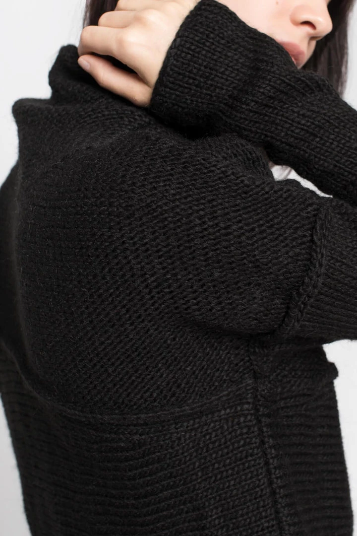 Our oh-so-unique wool sweater for the casual but elegant look you crave. Emily’s made of multiple pieces joined by chunky seams and features extra long sleeves, a loose turtleneck, and extremely soft boucle-like Italian merino mix yarn. [SPLIT]