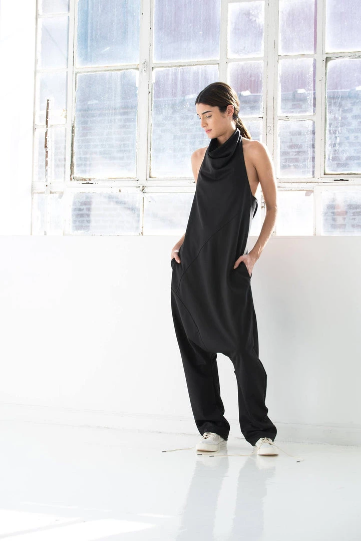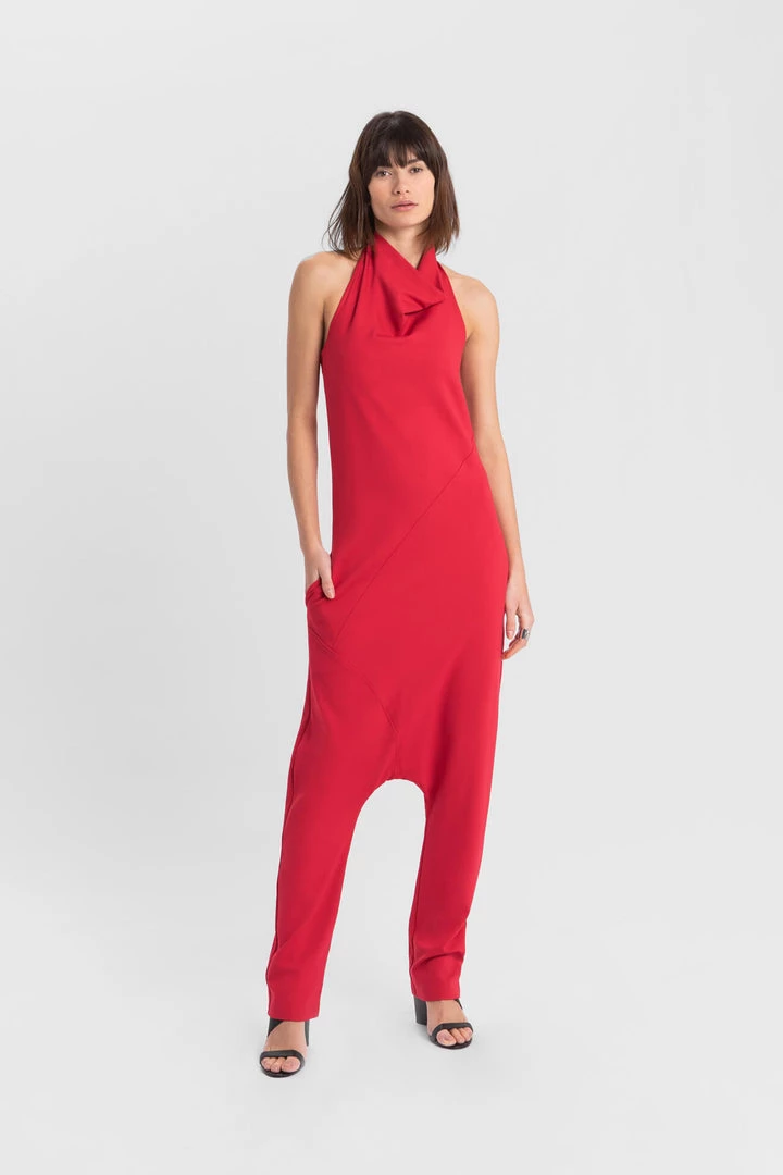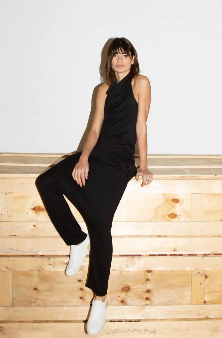 Channeling timeless cool, we created the Cynara Jumpsuit. Fashioned from our soft, mid-stretch European ponte fabric, she’s a full-length one-piece with a cowl neck halter and drop-crotch legs. Both edgy and elegant at once, Cynara makes a statement and is perfect for day-to-night wear. [SPLIT]