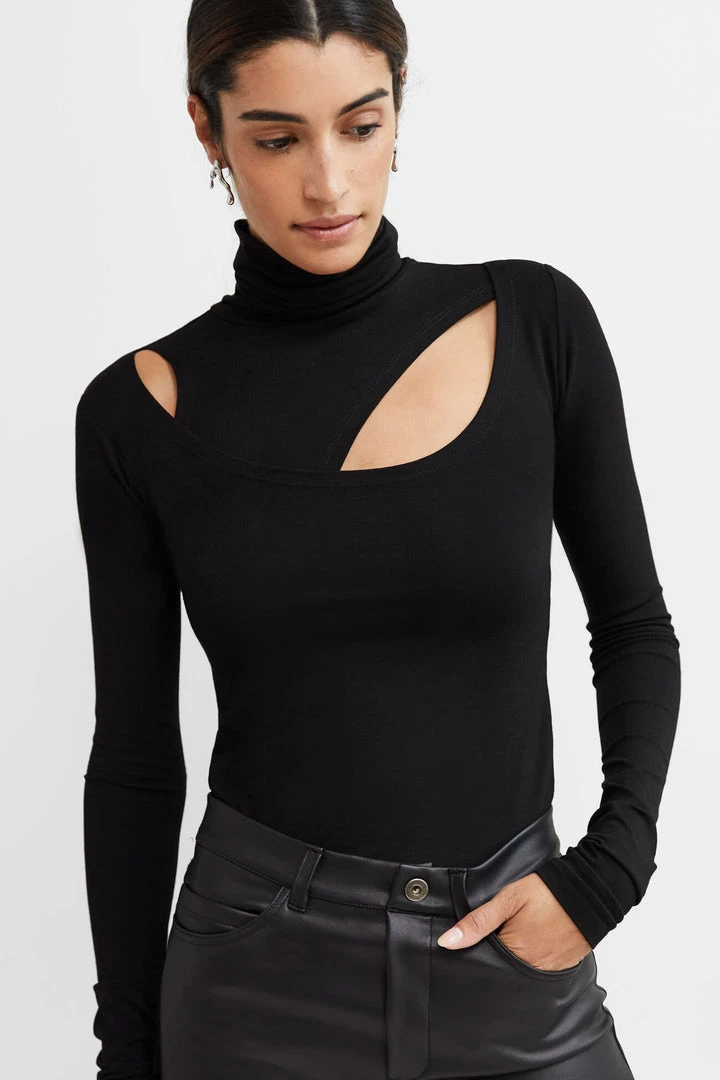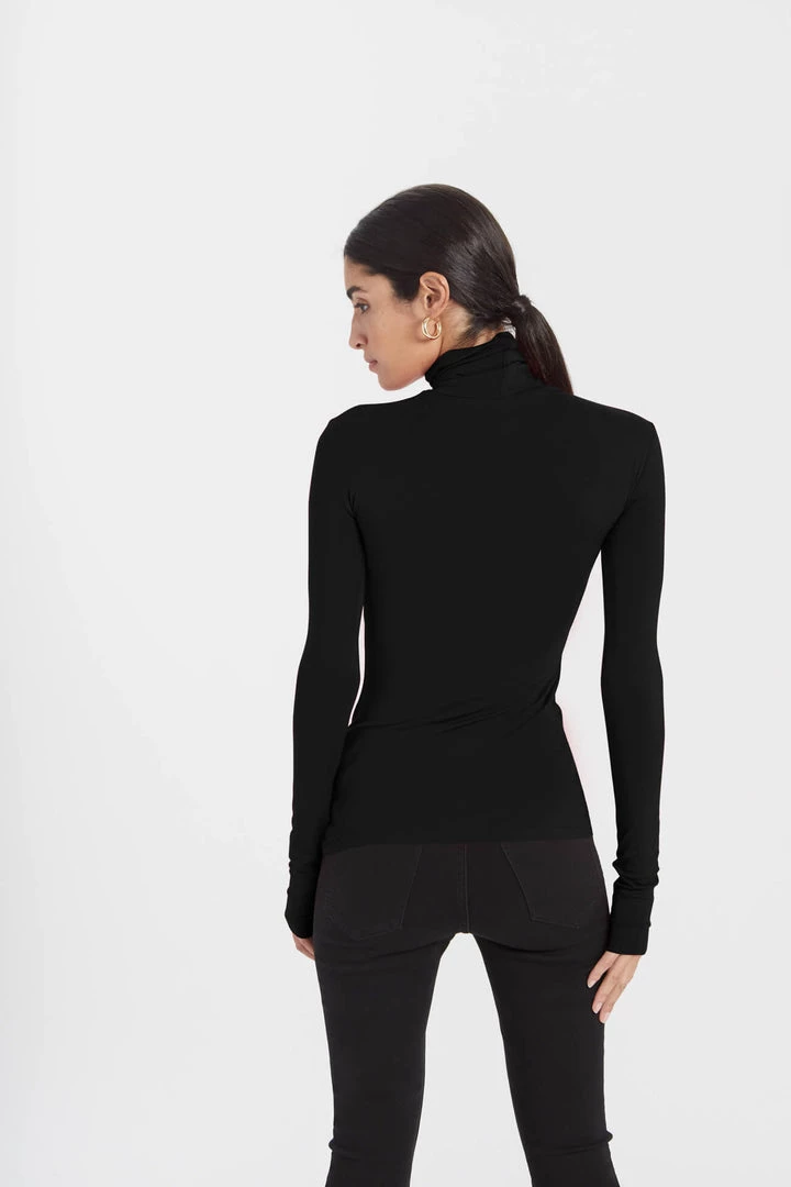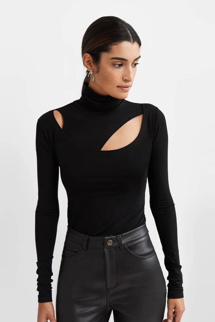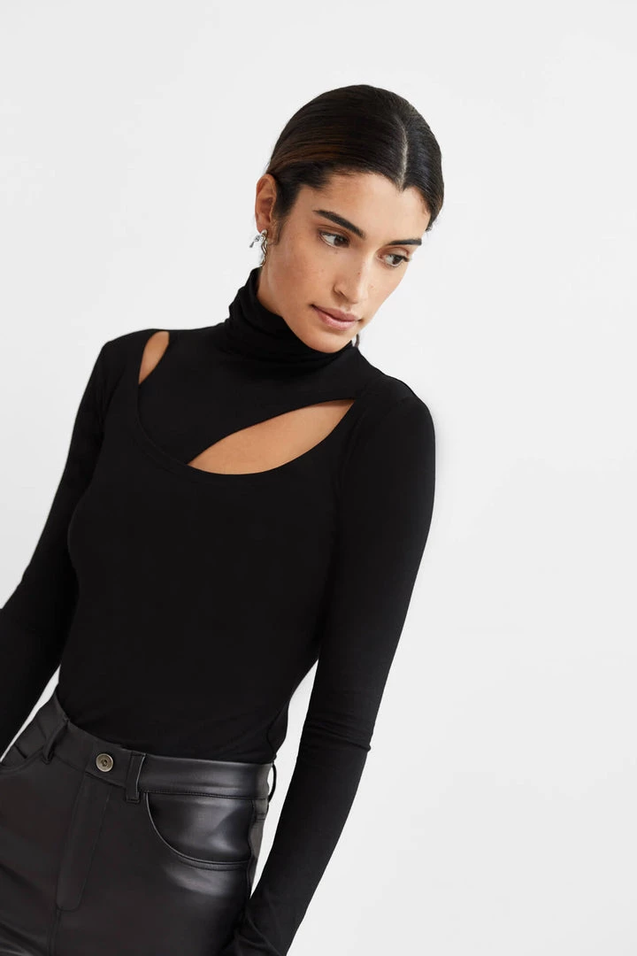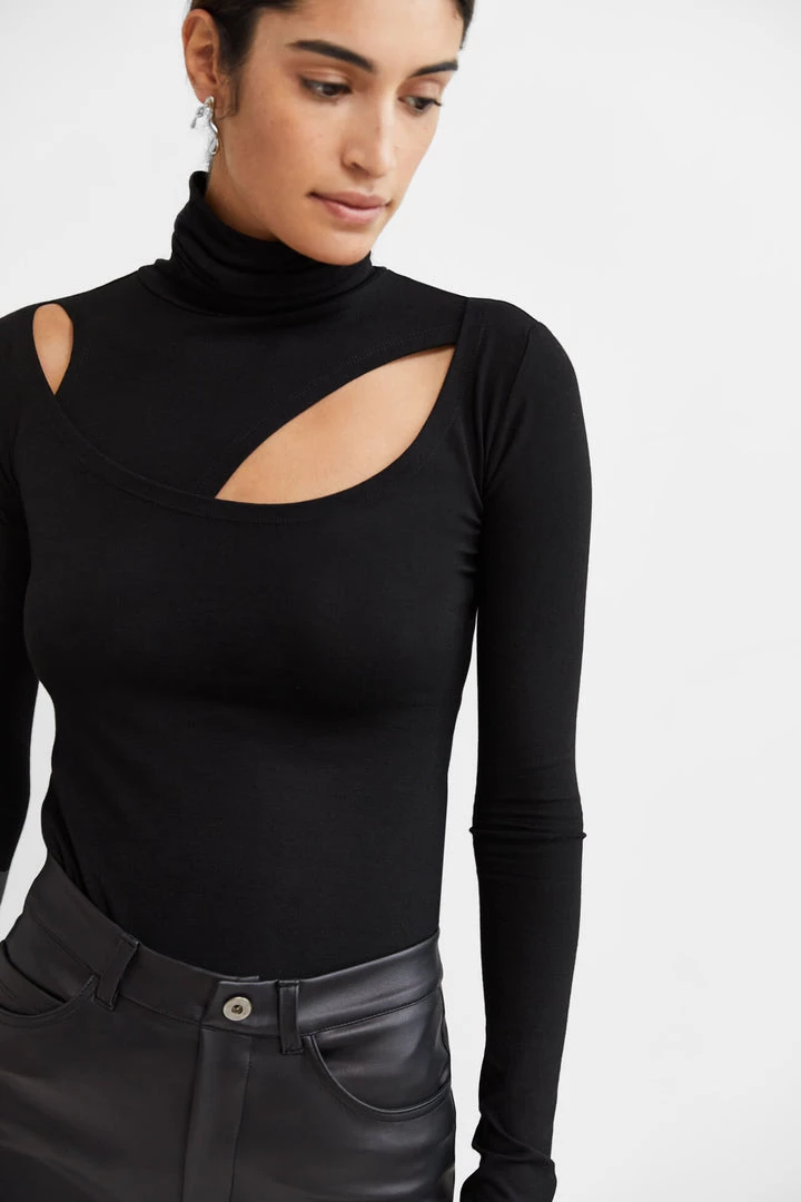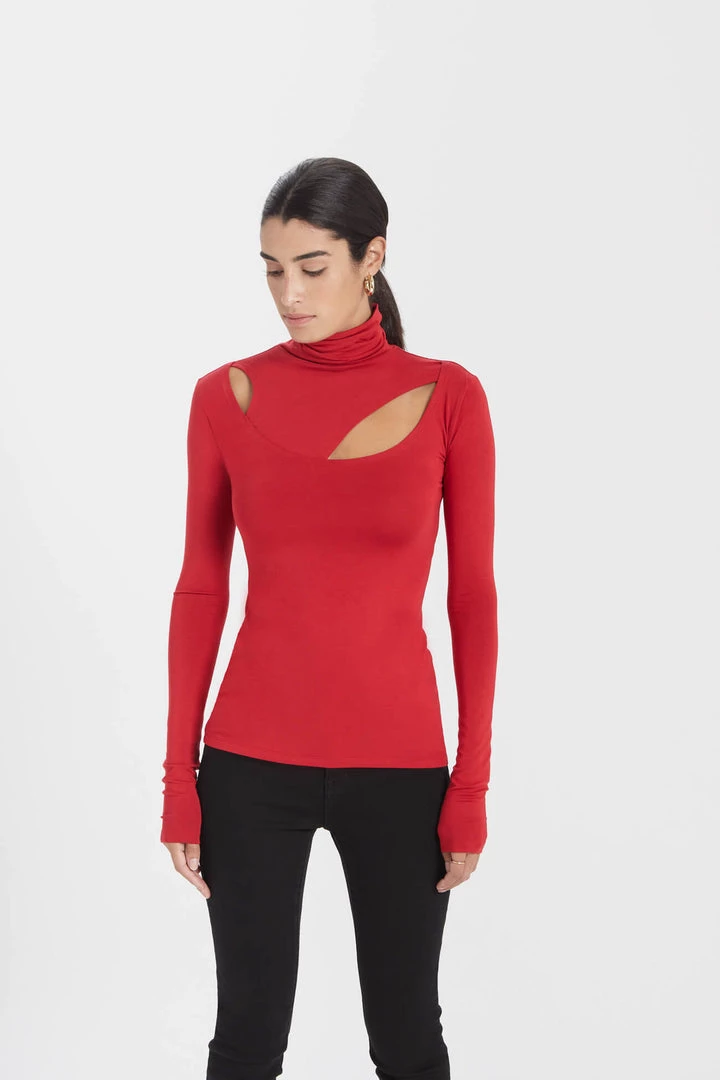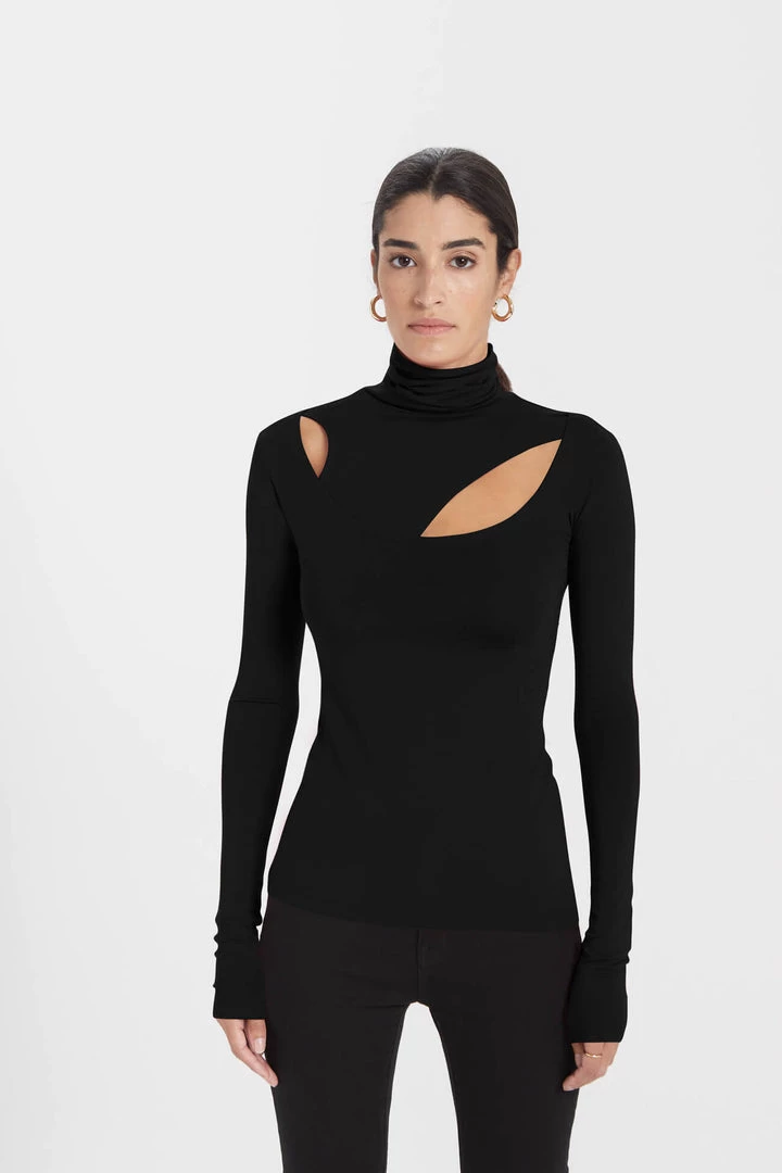 Introducing our Dahlia, a striking top perfect for any weather. Her unique neckline cut-out creates an edgy, one-of-a-kind silhouette ideal for dressing up or down. Dahlia’s fashioned from soft, eco-friendly European jersey that is high-stretch to provide comfort and style throughout the year. [SPLIT]