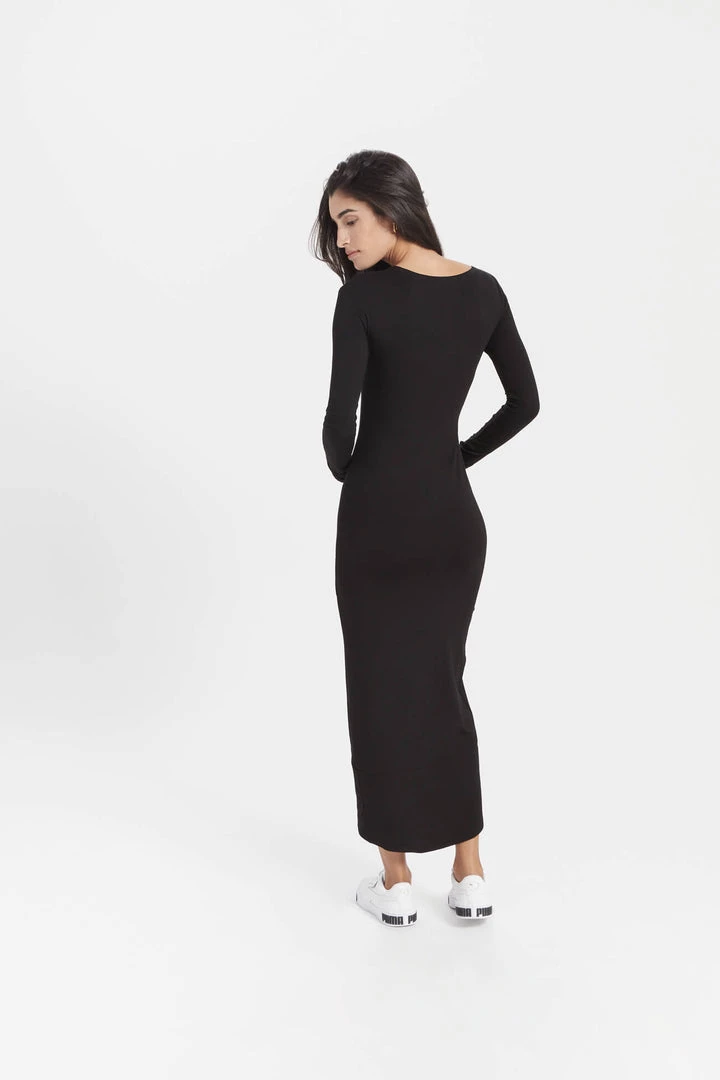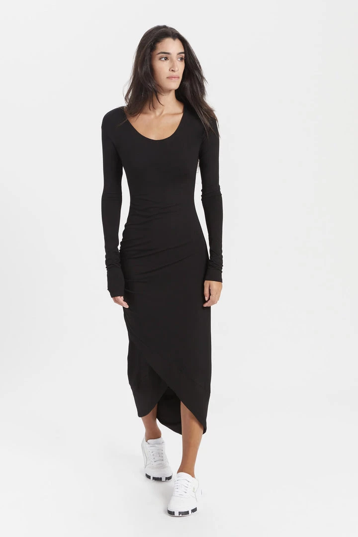 When days start to get shorter and hems, longer, reach out for the Devon Dress. It’s an updated take on the essential knit dress. Complete with a wrap skirt and tulip hem raised just above the ankles, this piece is the perfect canvas for statement winter boots. Made from premium jersey fabric, this dress lends just enough stretch while minimizing creases—so you always look put-together on the go. [SPLIT]