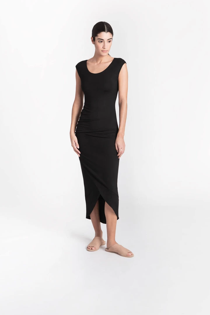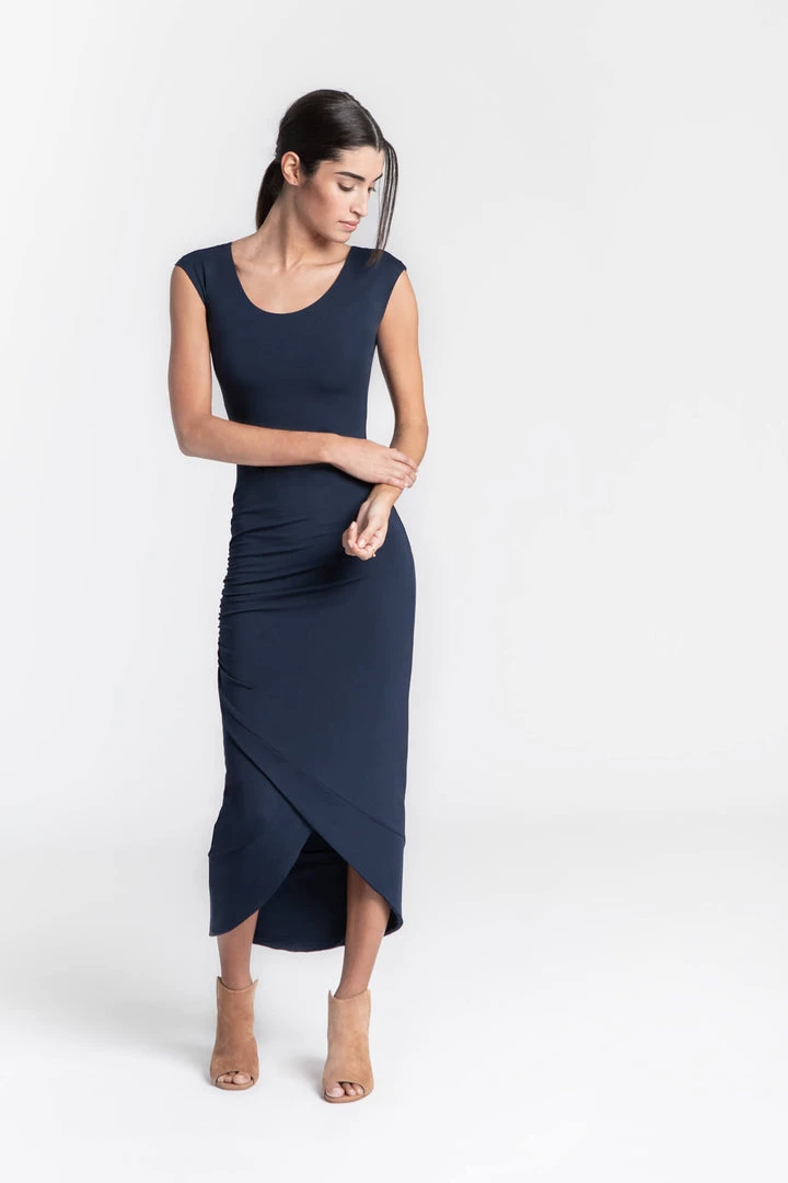 Tap into your inner Grecian goddess with this beautifully draped midi dress in classic colors. The high neck and cap sleeves give this piece a modern edge that stands out in a crowd. [SPLIT]