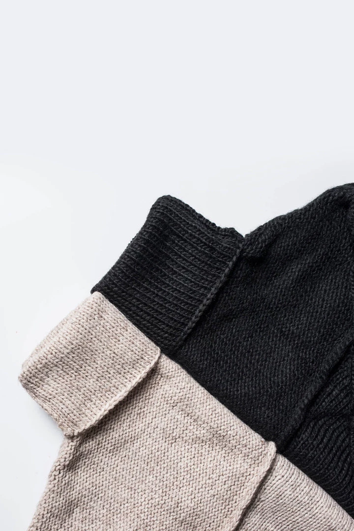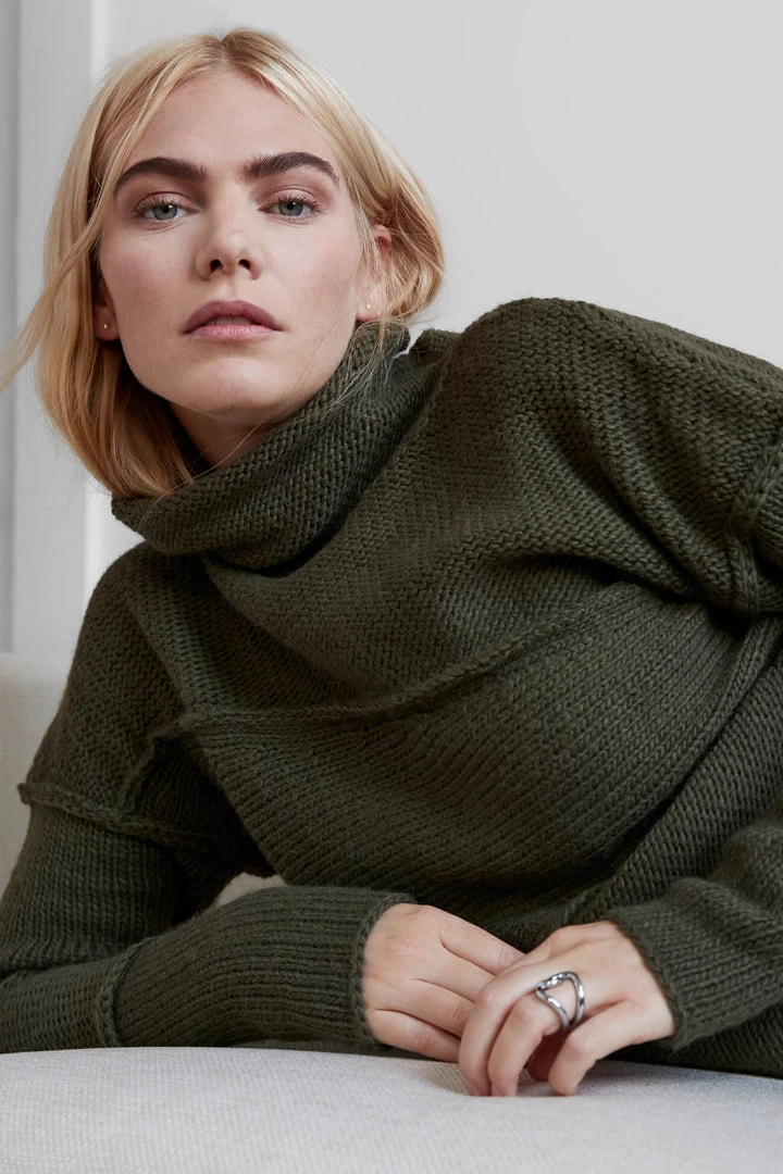 Our oh-so-unique wool sweater for the casual but elegant look you crave. Emily’s made of multiple pieces joined by chunky seams and features extra long sleeves, a loose turtleneck, and extremely soft boucle-like Italian merino mix yarn.[SPLIT]