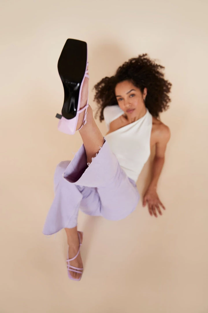 - Julia wears Linette in pink and in black. Laura wears lilac. Christina wears black.