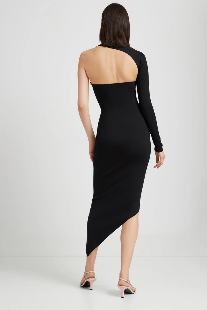 Introducing our love letter to the edge and allure of New York: the Manhattan Asymmetric Dress. Her unique halter neckline catches the eye, wrapping around to create one elongated sleeve. Her midi cut falls to an asymmetric hem to complete a show-stopping silhouette. Crafted from our soft, mid-stretch European ponte jersey, she features a smoothing stretch that effortlessly hugs the body.[SPLIT]