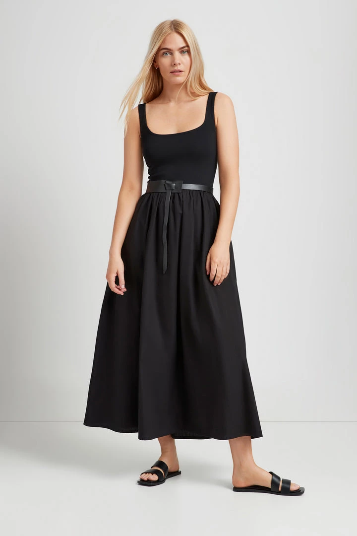 Our Clara Dress is your perennial warm weather staple—a classic, comfy black dress that flatters all shapes and will always stay in style. Her top features a low scoop neckline with tank straps and a stretchy fit, crafted from soft European ponte fabric. Her skirt is fashioned from 100% European cotton with a side zip for easy wear, offering full coverage and all-day comfort. And, yes, Clara has pockets![SPLIT]