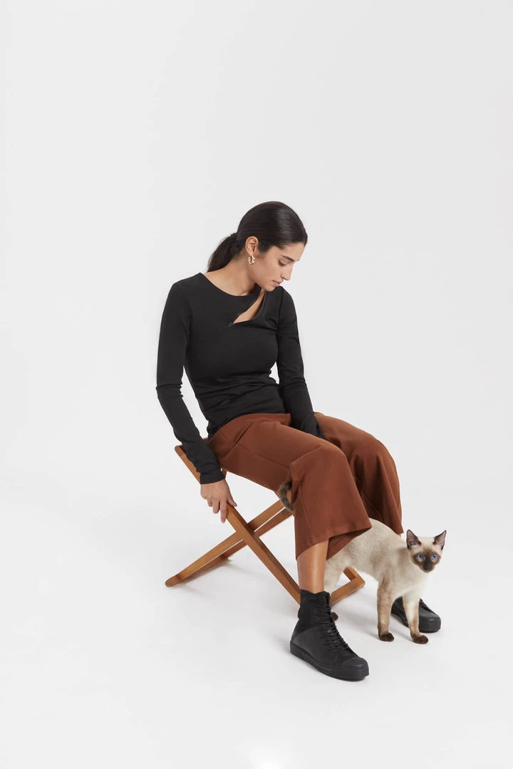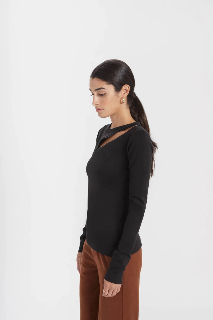 Long sleeve top with an elegant leaf-like opening, with vegan leather detailing. A perfect top for a night out, revealing the right amount of skin for a stunning look.[SPLIT]