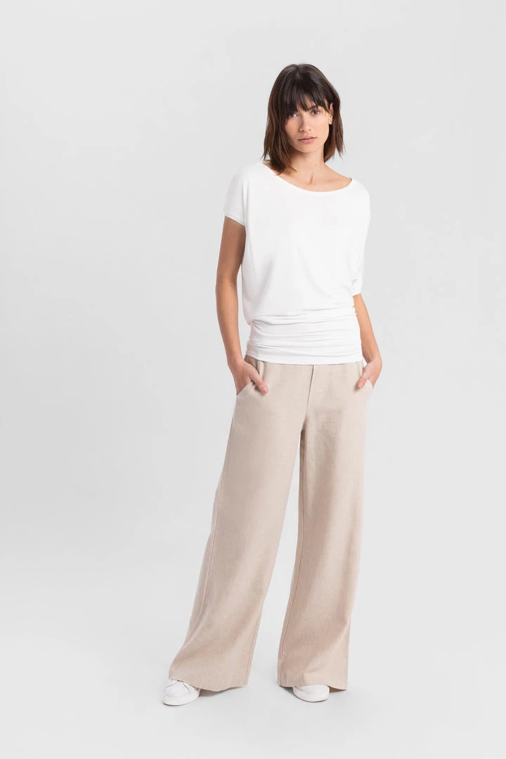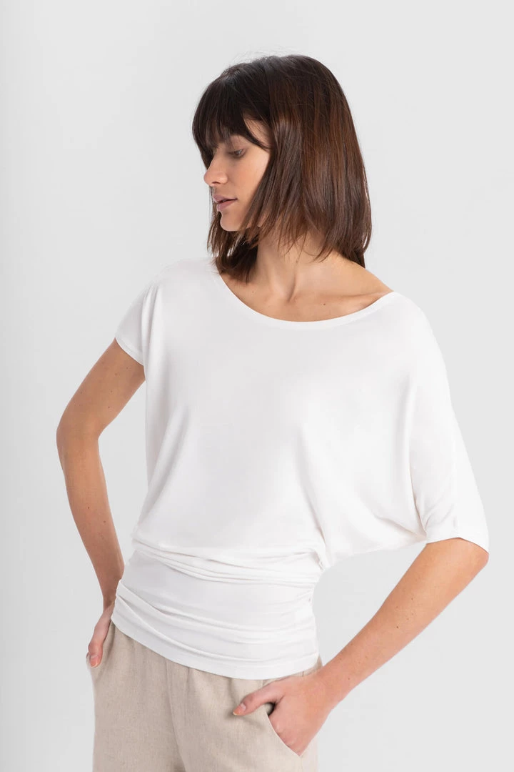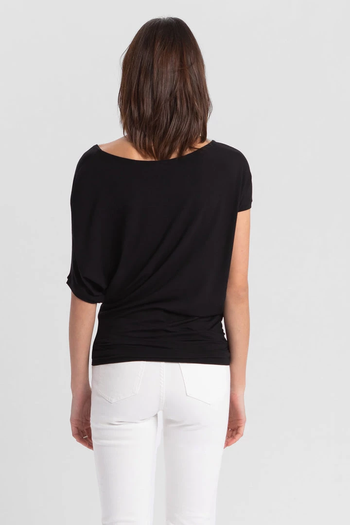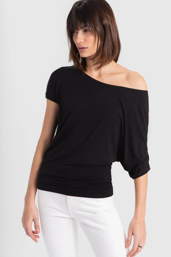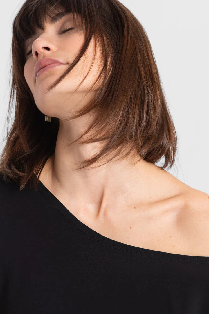 Slip on our Elena Top for casual Fridays or Sunday brunches. Lovingly crafted from our silky-soft, eco-friendly European jersey, she’s high-stretch and can accommodate any movement. Elena highlights your collarbones with a wide neckline and hugs your hips. She also features an elbow-length batwing sleeve on the left and a shorter sleeve on the right, adding visual interest to your overall look.[SPLIT]