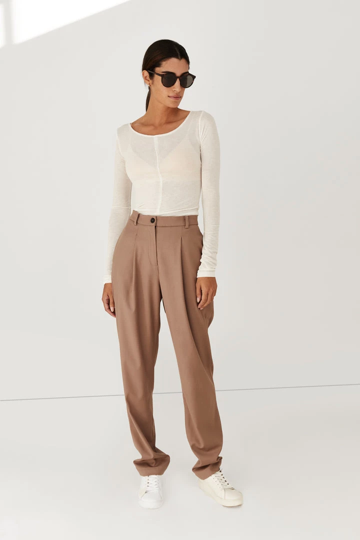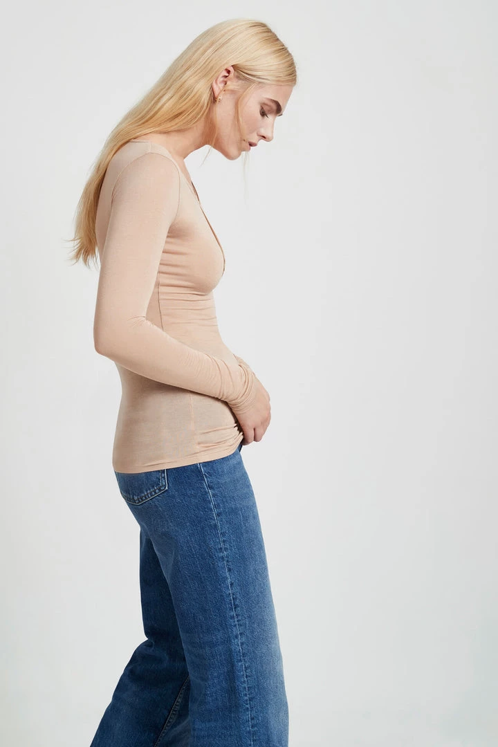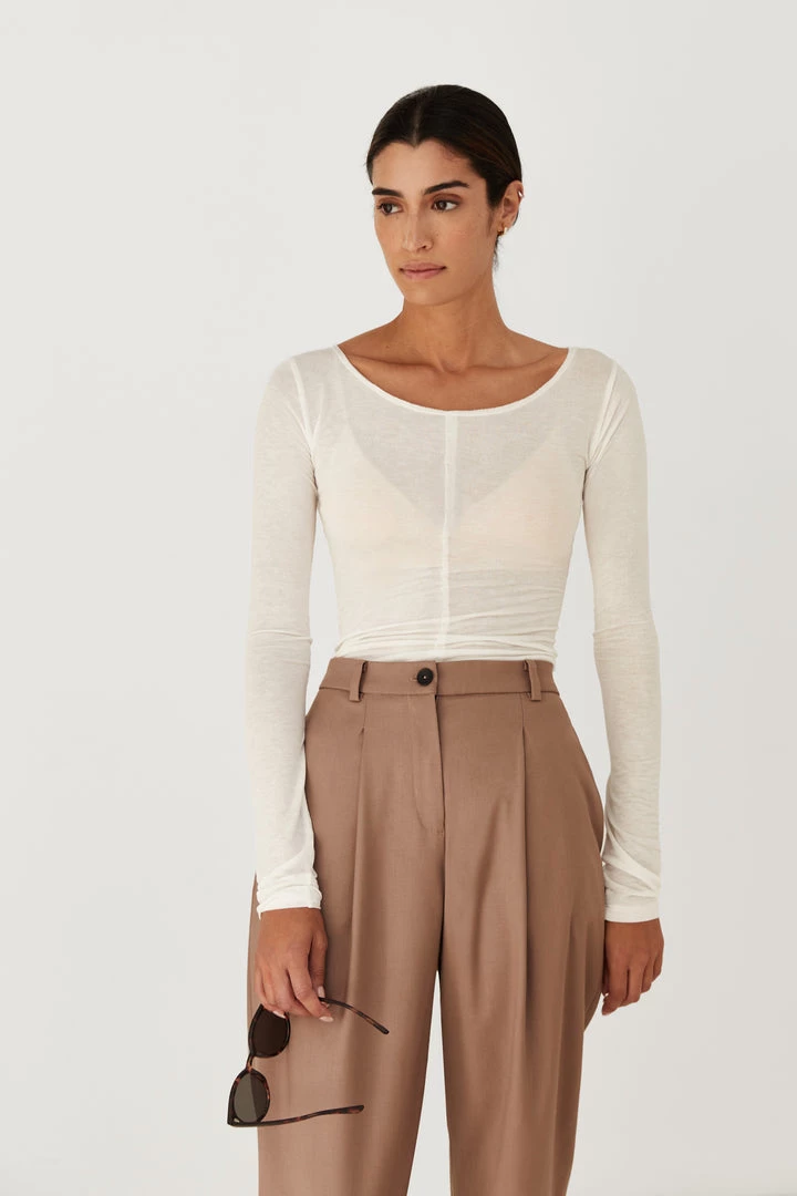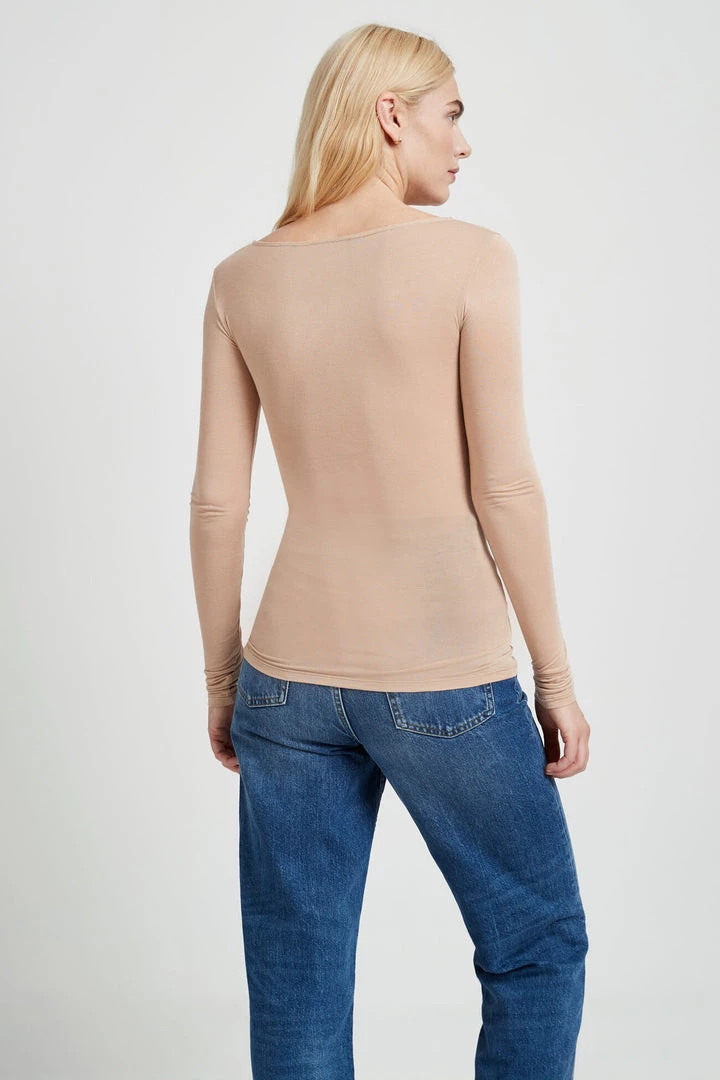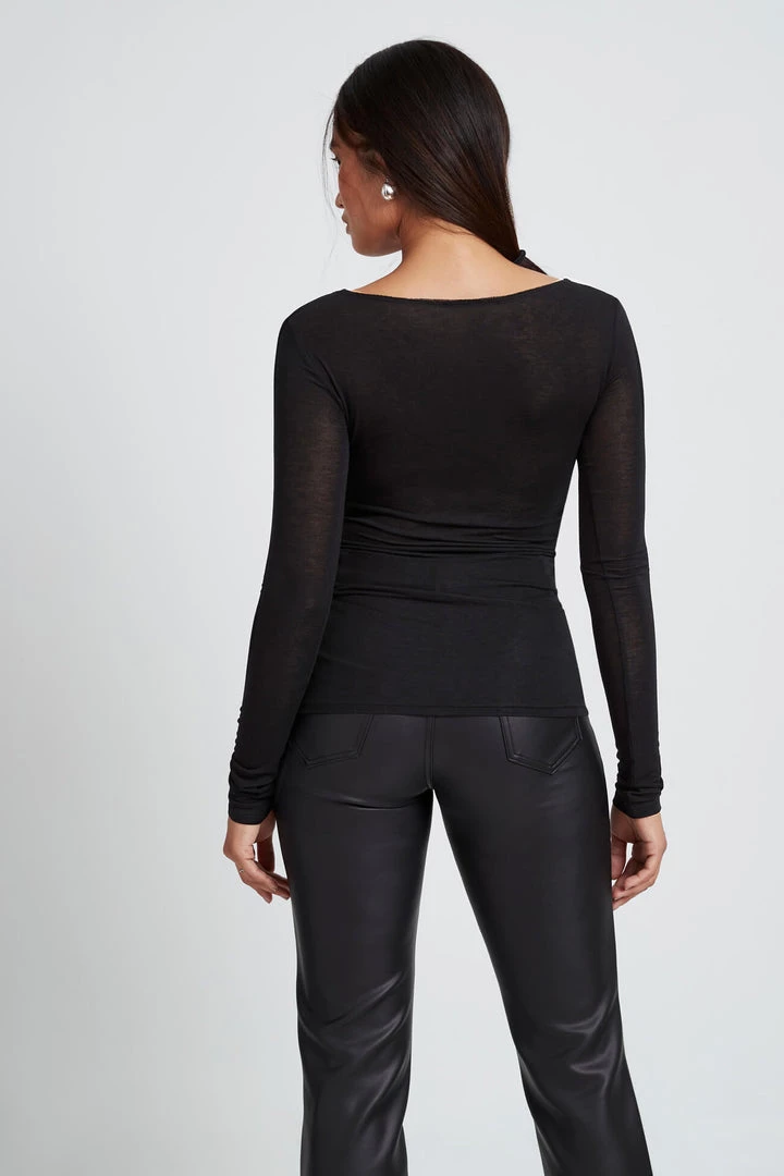 The wardrobe essential for all seasons, our Eva Top has a seamless cut and ballerina-like fit. She features a graceful scoop neckline, extra-long sleeves and a vertical raw-edge seam in front that adds just the right amount of edge. Fashioned from our silky-soft, high-stretch European sheer jersey, she’ll easily dress up or down, as well as perfectly layering for cooler temps.