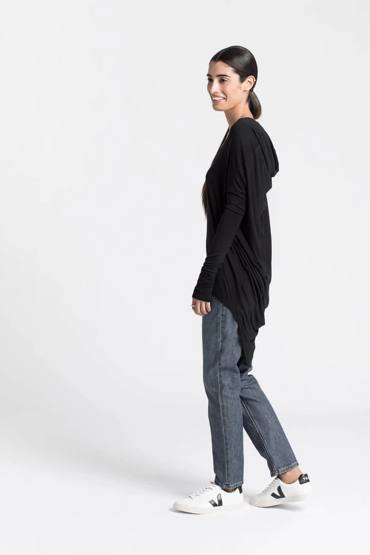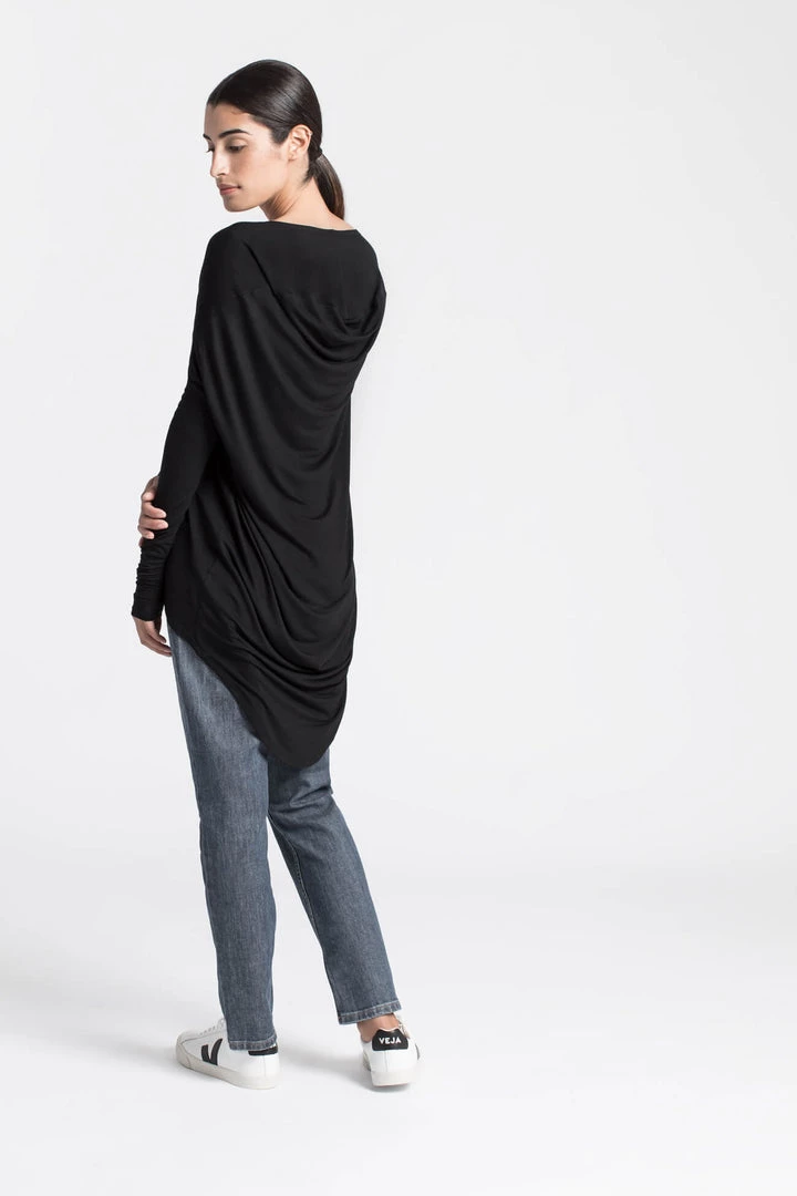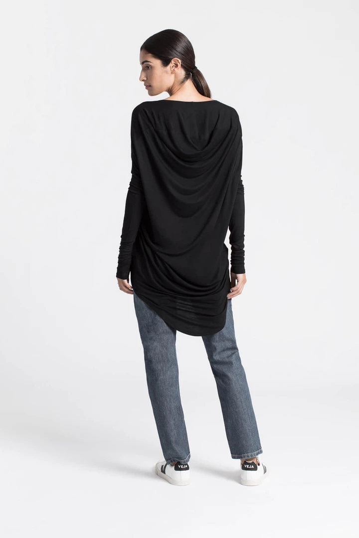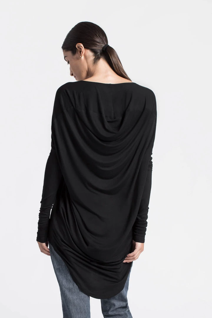 Beautiful, elegant, unique top with a cowl back. Extra long sleeves for an edgy, classy look. This is the perfect loose, draping blouse to feel cozy and stylish this spring. Multifunctional piece for any occasion. Can be dressed up or down. Now available in sheer black material, silky and elegant. We recommend wearing the top with a tank top underneath. [SPLIT]