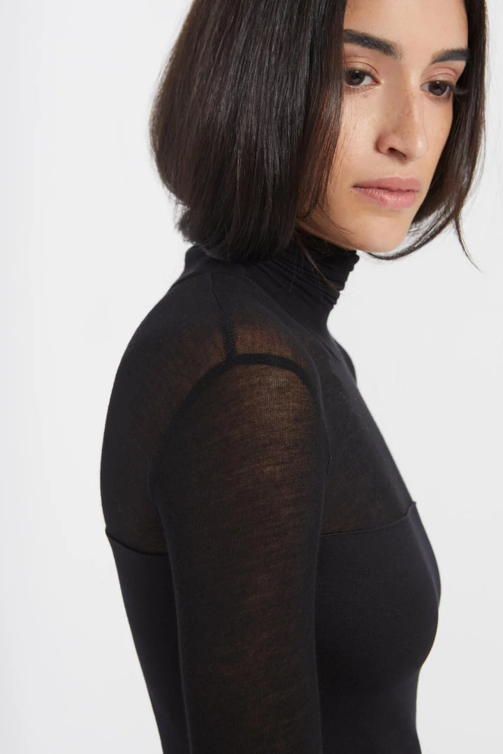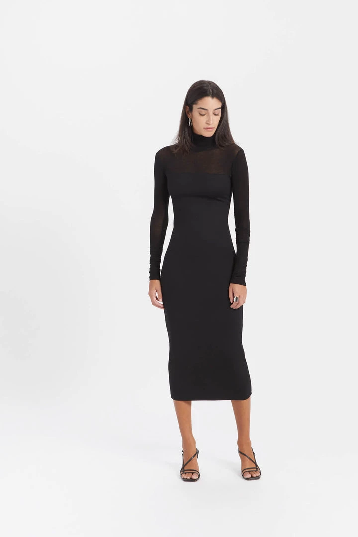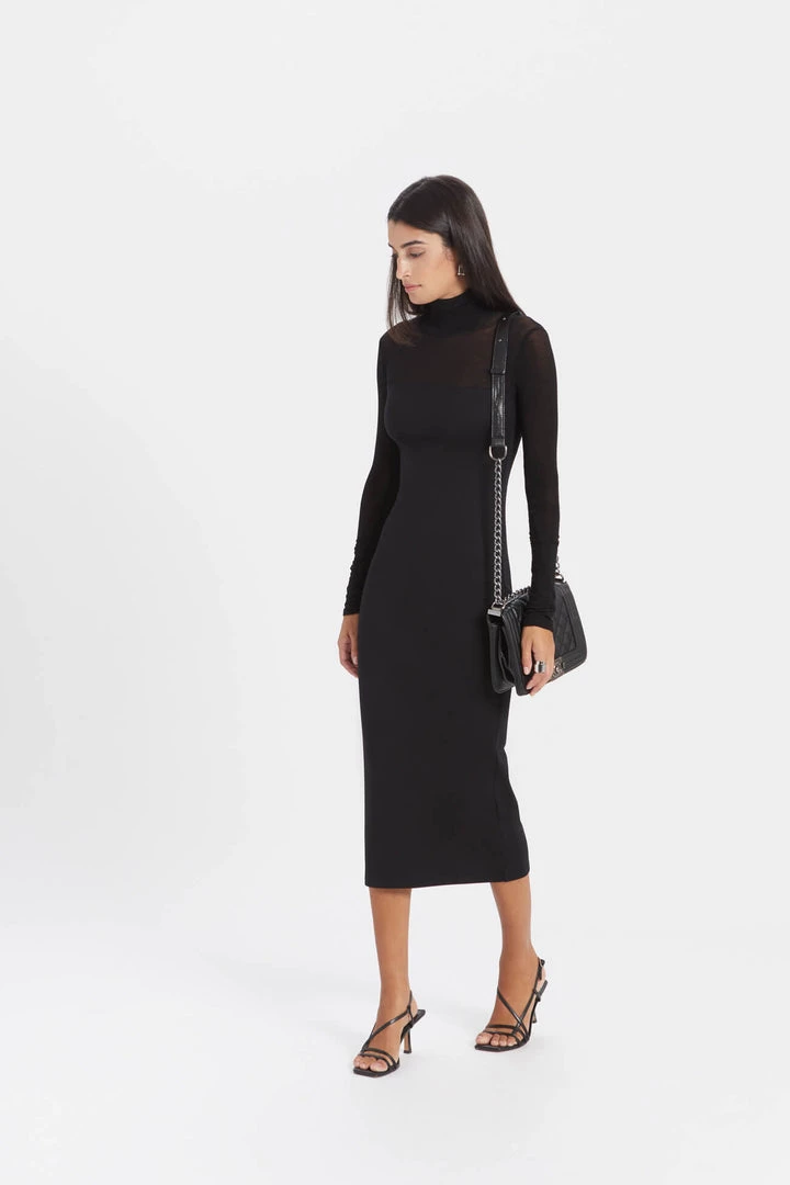 Beautiful simplicity. Our Marina is an elegant but subtly arresting midi dress with a turtleneck, European sheer jersey neckline, and extra long sleeves. She’s fashioned from our softer, structured, mid-stretch European ponte for a body-hugging fit. We recommend wearing Marina with a strapless bra. [SPLIT]