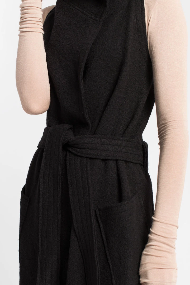 Show up, in style with this wool knee-length elegant vest. The exceptional details really make this outerwear a style statement, you can easily take it from summer through to the winter seasons by pairing it with chunky knits and knee-high boots. The larger than life paneled collar that comes together just above the chest, the cinching in of the waistline with a belt, and large pocket details, give you defined elegance, combined with super-soft wool. Go on, you deserve this. [SPLIT]