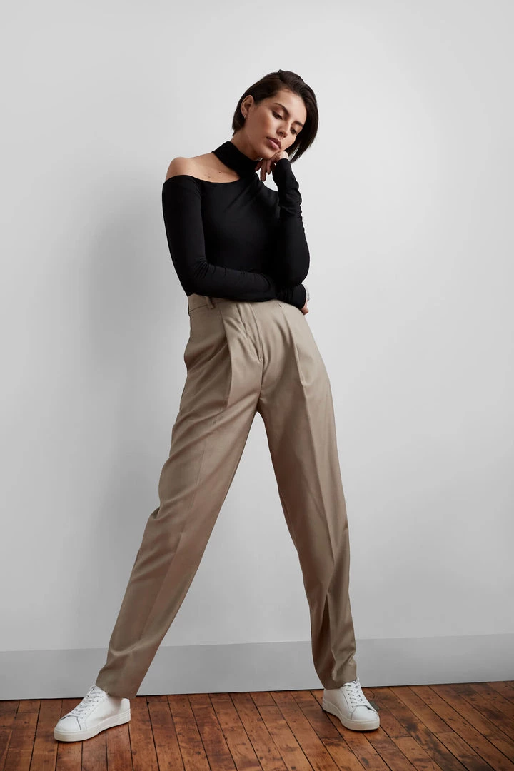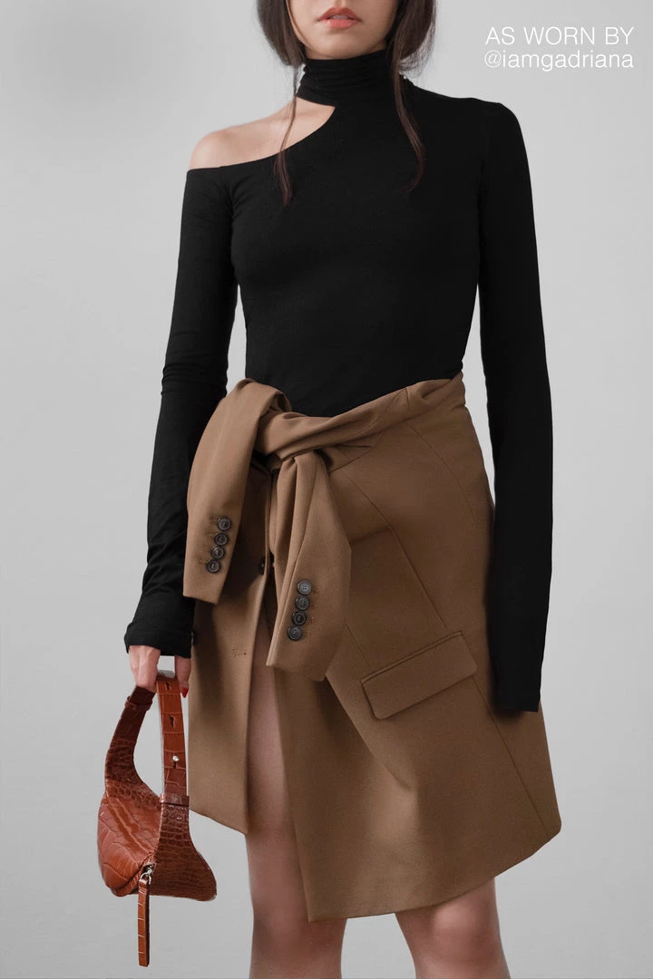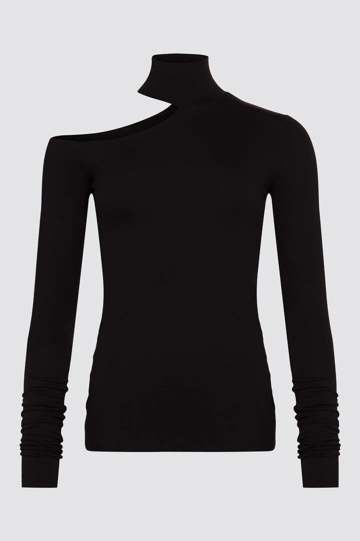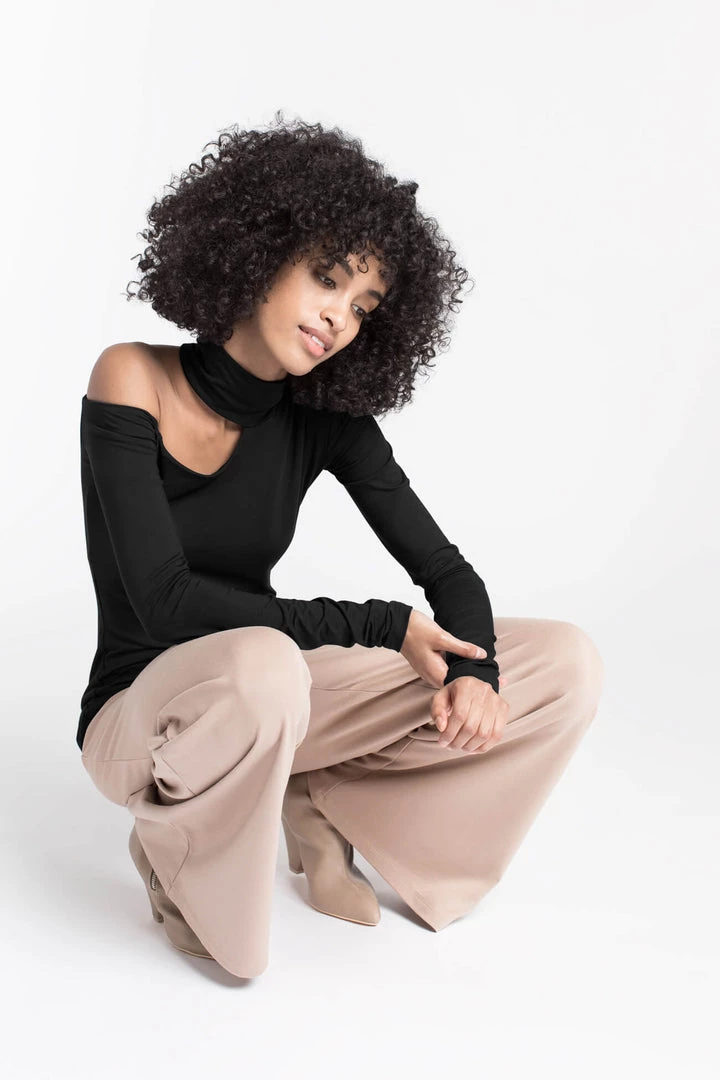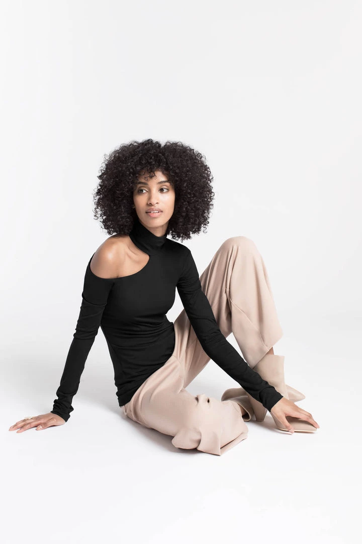 Meet Evan, our cut-out top that’s uniquely sleek. Her mock neck design bares one shoulder and features extra-long sleeves for an ultra-refined finish. Fashioned from our sustainable, high-stretch European jersey that feels as silky as it looks, Evan effortlessly combines comfort and chic.[SPLIT]