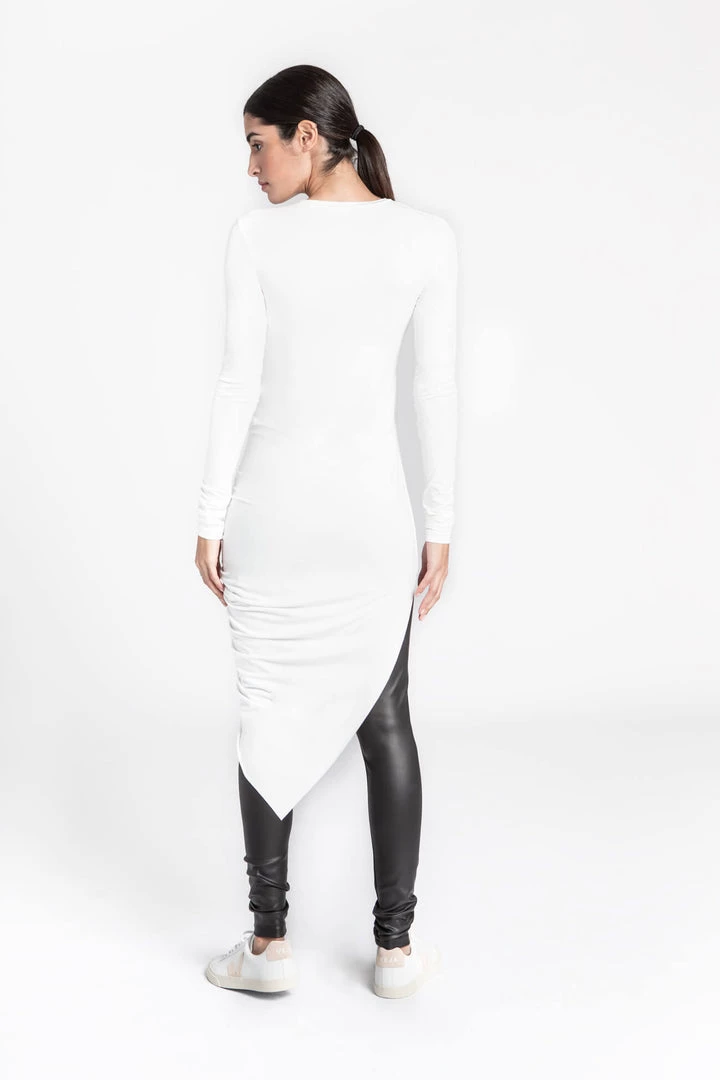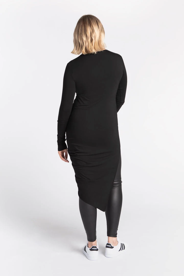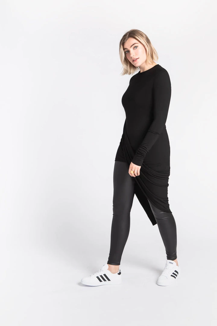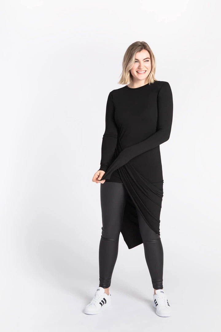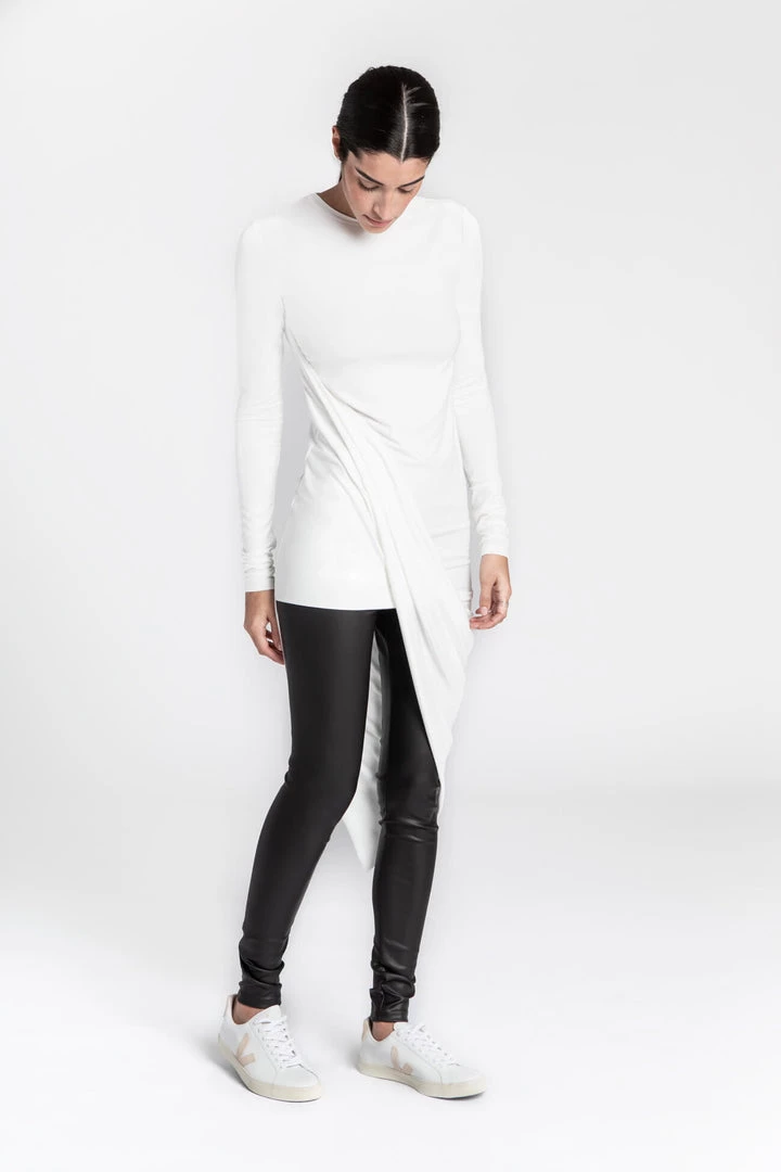 Hillary is the antidote to your routine tops. She makes the “everyday” feel more special with a standout drape design that cascades to an asymmetric, knee-grazing hem. Sculpted from our beloved, silky European jersey, Hillary lends a playful flow as you move through your agenda.[SPLIT]