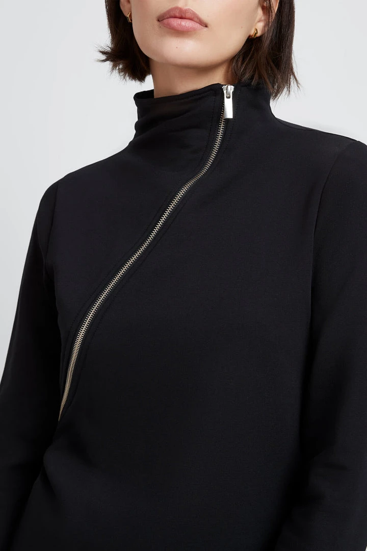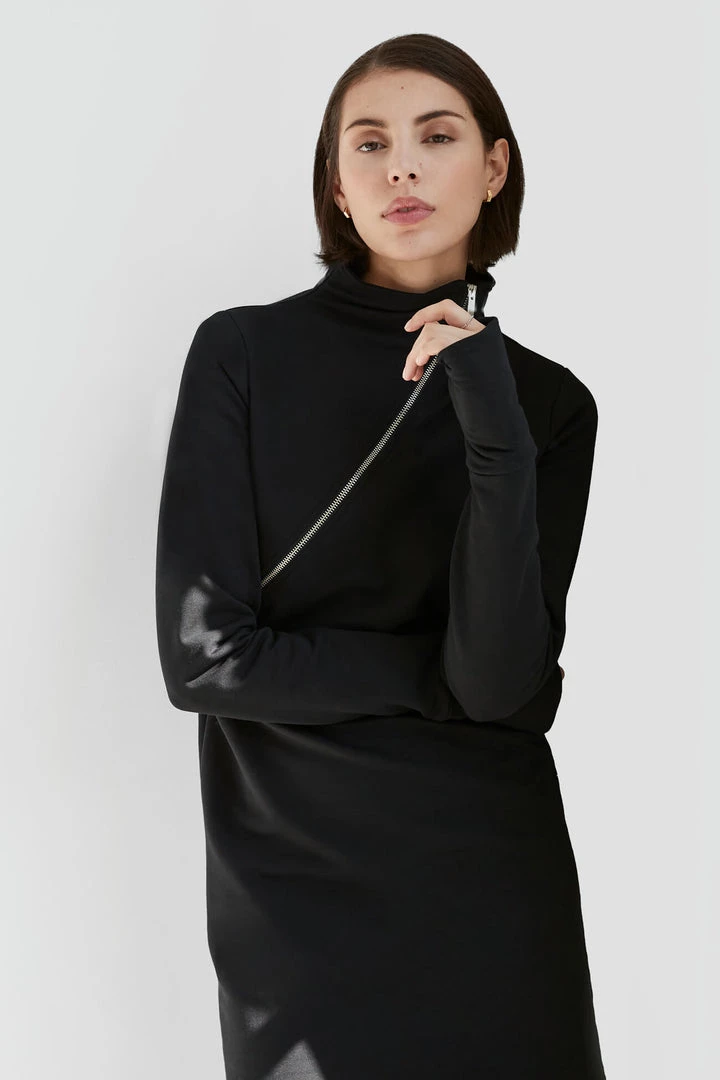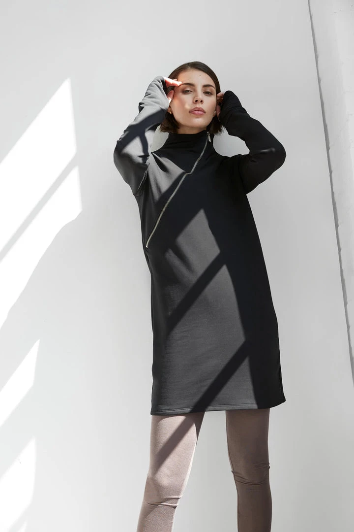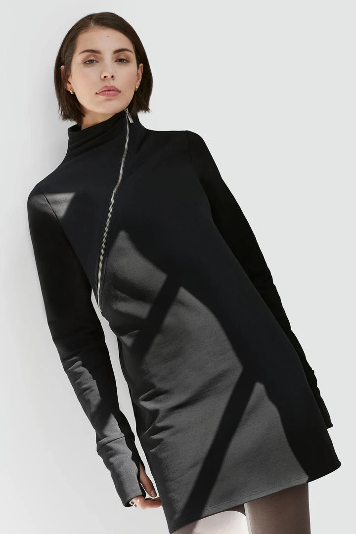 We’ve evolved the sweatshirt dress beyond just simple, warm, and cozy—Ilana checks all the boxes as an elevated staple piece you’ll cherish. An asymmetric zipper drapes diagonally over the chest, complemented by accent zips on the skirt and sleeve. Her relaxed fit in heavier but breathable European French Terry combines with extended sleeves with thumbholes for peak comfiness. Ilana’s perfect for layering with leggings, too. [SPLIT]
