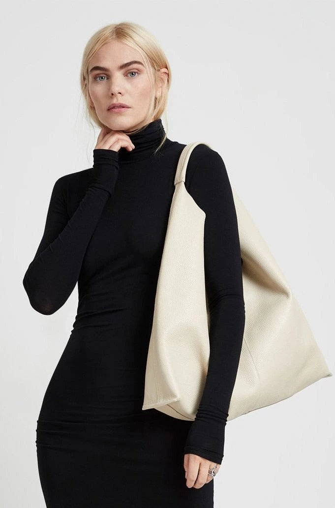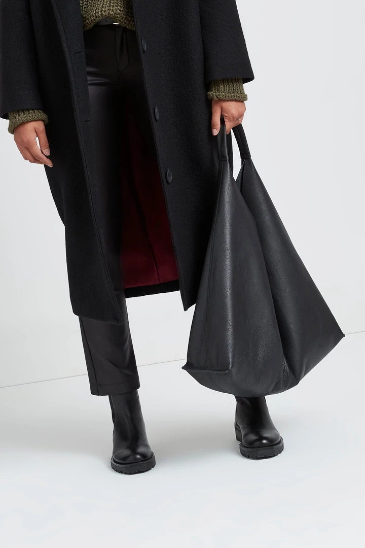 Upgrade all in one with our larger-than-life Kelly Tote. This oversized handbag made of genuine Italian leather features a triangular silhouette with a wide opening and a magnetic closure, plus a sturdy, flat handle. There’s plenty of room inside for your essentials—space enough to fit a 13-inch laptop, a water bottle AND a good read. Moreover, our Kelly’s unlined, which renders a soft and slouchy look. Extremely limited edition, so act fast![SPLIT]