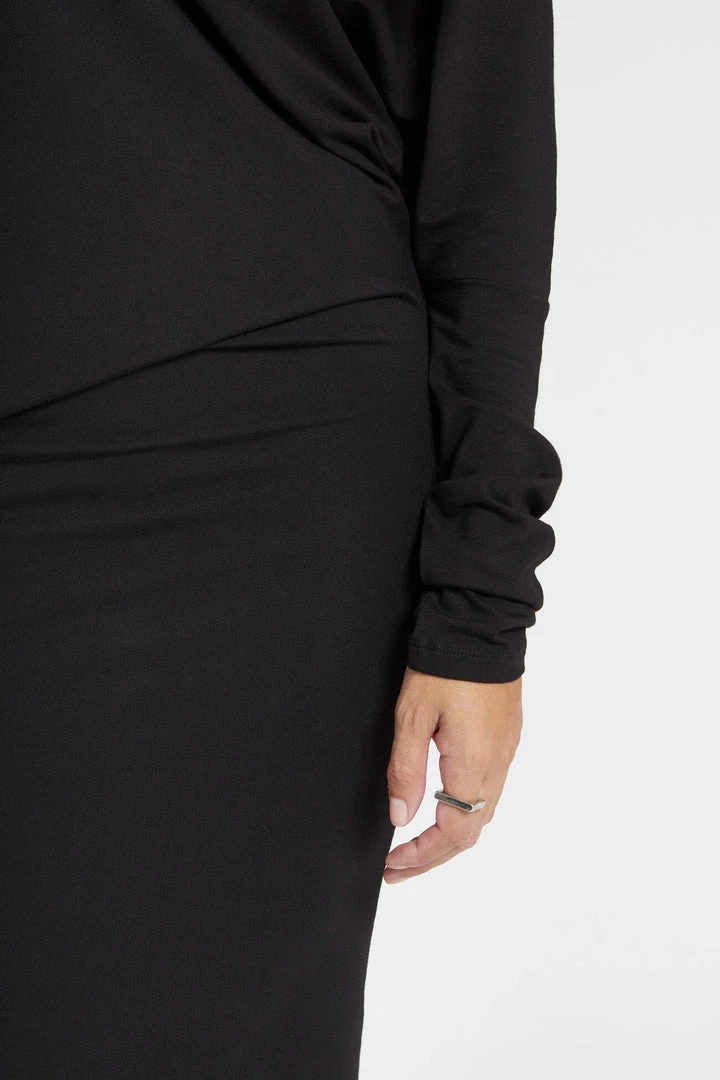 With a draped shoulder and snug skirt that grazes your knees, the Malinda dress IS versatility. Slip her on and automatically be styled for anything – work or lounging. She can be worn on or off shoulder and, of course, there are those fantastically cool relaxed puff sleeves. Fashioned from our signature European jersey, Malinda features a high-stretch silkiness that will make you feel like you’re wearing nothing at all. [SPLIT]