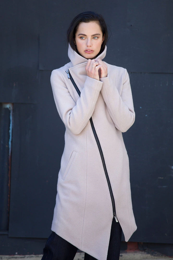 Stand out in our cozily chic Maren Coat. Maren features a diagonal two-way zipper and an asymmetrical bottom hem, coupled with a high wrap neckline that will keep you warm while always stylish. The tunic length offers a fit that’s both comfortable and flattering.