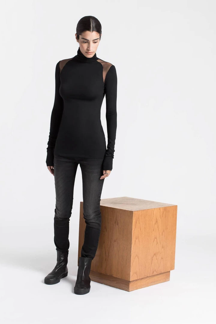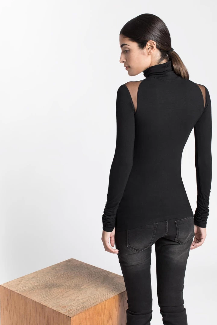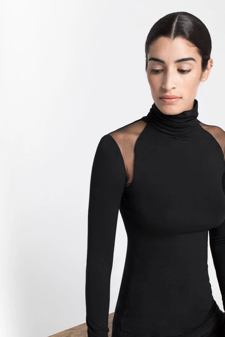 Break the mold with Maria, our turtleneck with a twist. Fashioned from a high-stretch, silky soft combination of sustainable European jersey and European mesh, she features unique symmetrical mesh panels that reveal the perfect amount of shoulder. Maria can be effortlessly dressed up or down – your choice! [SPLIT]