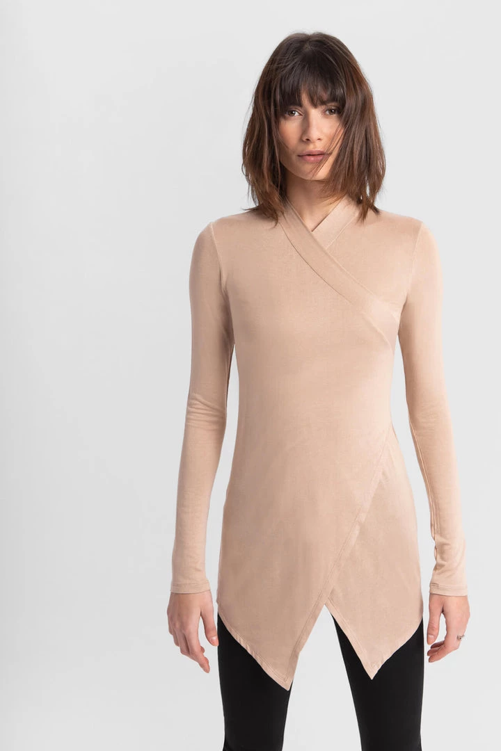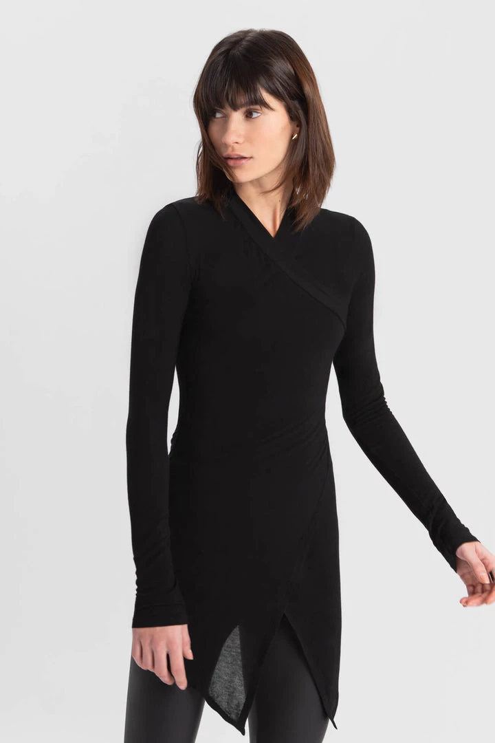 Our Morgan Tunic is the effortlessly elegant statement top you can dress up or down. Featuring a high v-neck and kimono-inspired faux wrap silhouette that allows for movement with ease, she’s crafted from our soft, lightweight European sheer jersey, which is high stretch while never losing form. Pair her with skinny jeans and sneakers for a head-turning, yet laid-back look.[SPLIT]