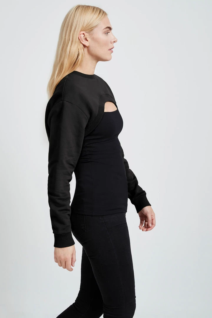Meet the Sweatshirt Shrug. Our Nell Bolero can transform any top into cold weather-ready. Fashioned from our lush European French Terry, she’s elevated casual-wear made original. A classic crewneck with dropped shoulders instantly relaxes your frame and your look. Long sleeves are hemmed with ribbed cuffs, while a statement ribbed hem arches over the chest, heightening Nell’s double-take appeal.
