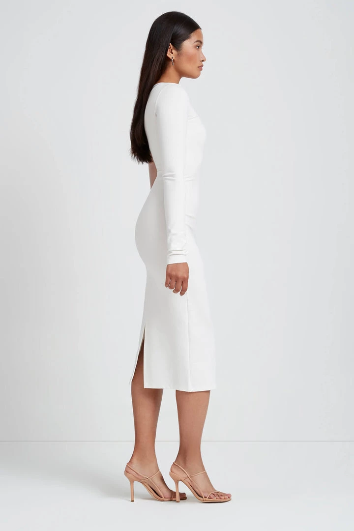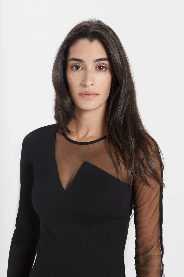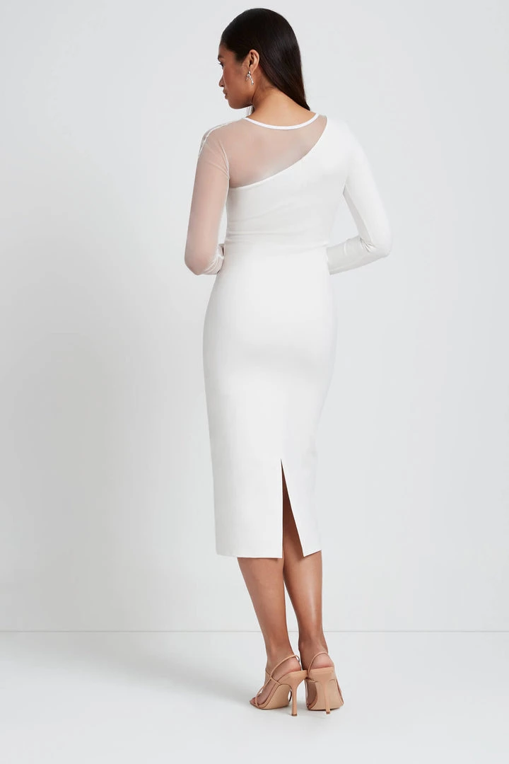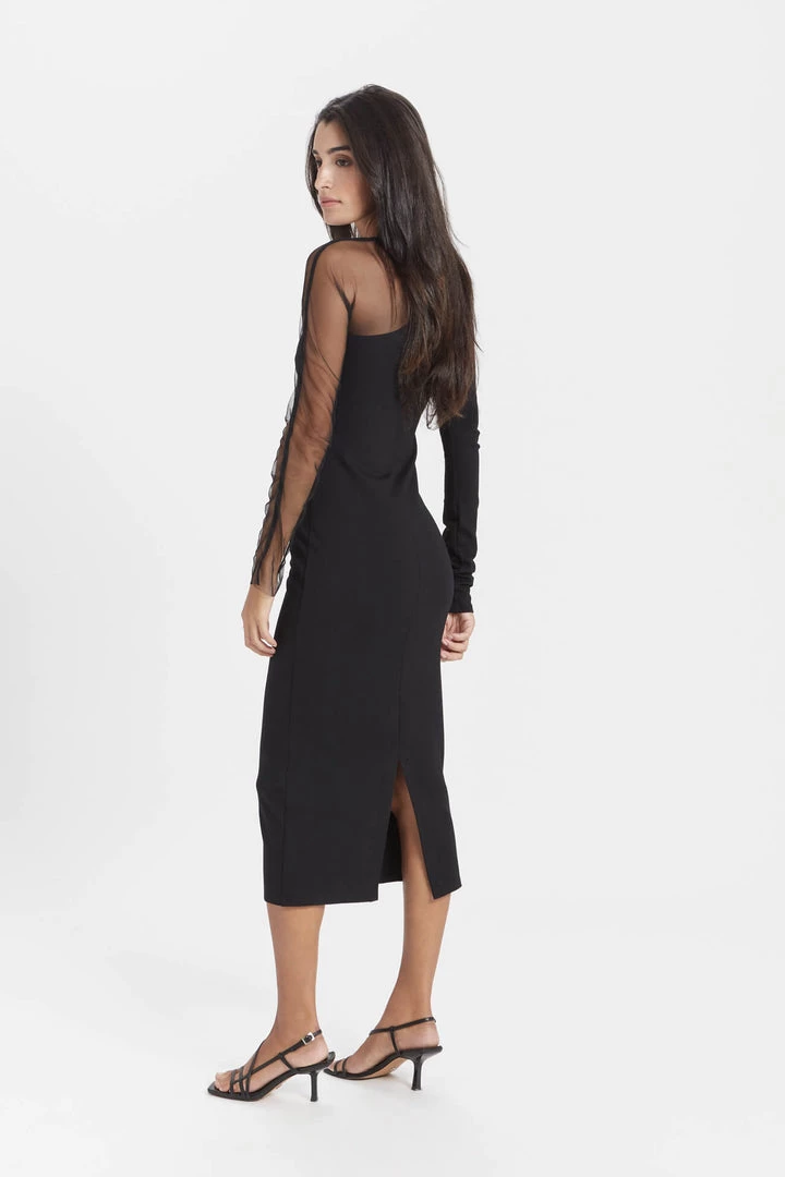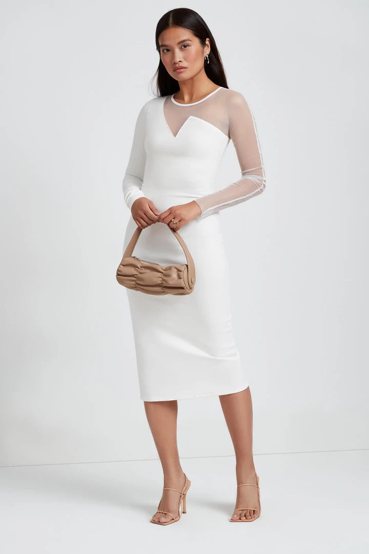 A unique neckline and asymmetrical mesh sleeve combine to make our Nolita Dress the perfect choice for celebrating new beginnings. Fashioned mainly from wrinkle-resistant, medium-stretch European ponte fabric with a touch of soft German mesh, Nolita provides an always forgiving fit but without compromising on the edge factor. She wears easily and she wows easily. Little styling needed but if you must: team her with simple sandal heels and gold link earrings. [SPLIT]