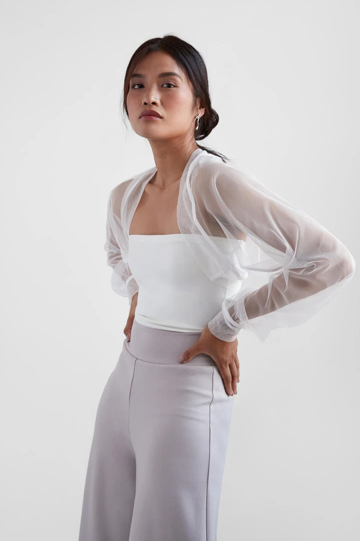 Light and airy, soft against the skin, our Olympia Bolero is pure glamour. Fashioned from premium European mesh, Olympia’s Juliette sleeves gather to a fitted cuff for a truly romantic silhouette, while the boning in the back holds the piece perfectly in place. Now available in both black and white to officially go with everything in your closet, she’s THE piece to take your night-out outfit to the next level. [SPLIT]