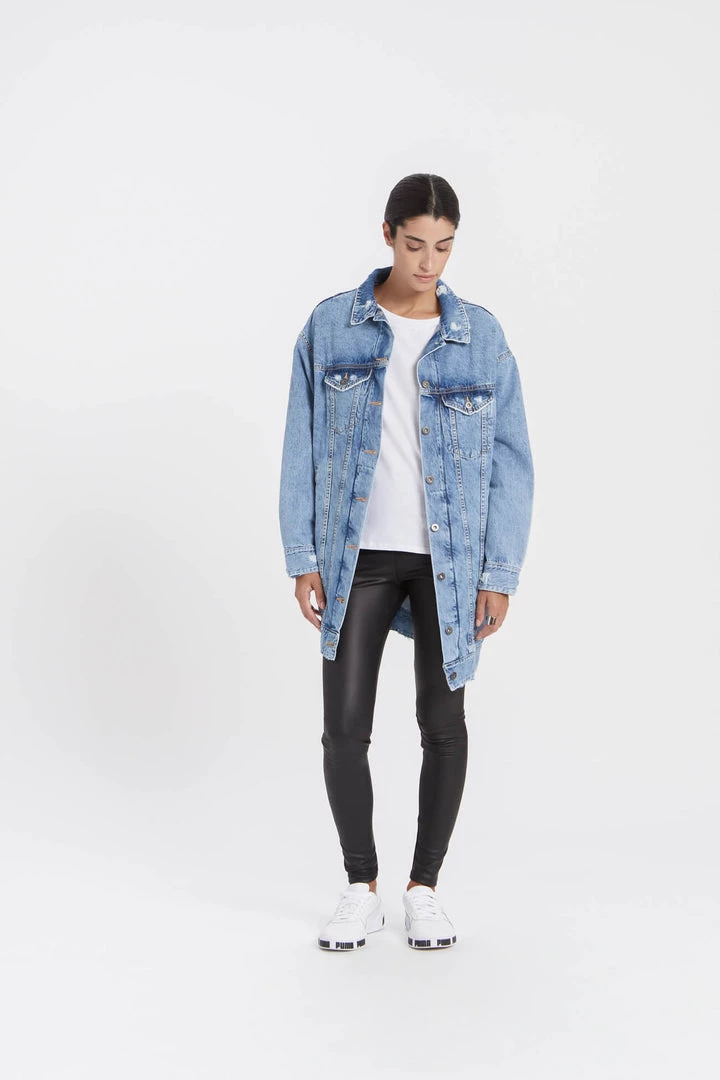 All about effortless cool, our Rio Denim Jacket is the easiest way to elevate your basics and add edge to your favorite, everyday pieces. She rocks a classic light-blue wash, distressed details, and extra-long length with an oversized fit, perfect to shrug on over just about anything. Patchwork seaming on the back and elongating vertical seams on the front make for a truly standout style. She’s a whole new kind of denim jacket.[SPLIT]
