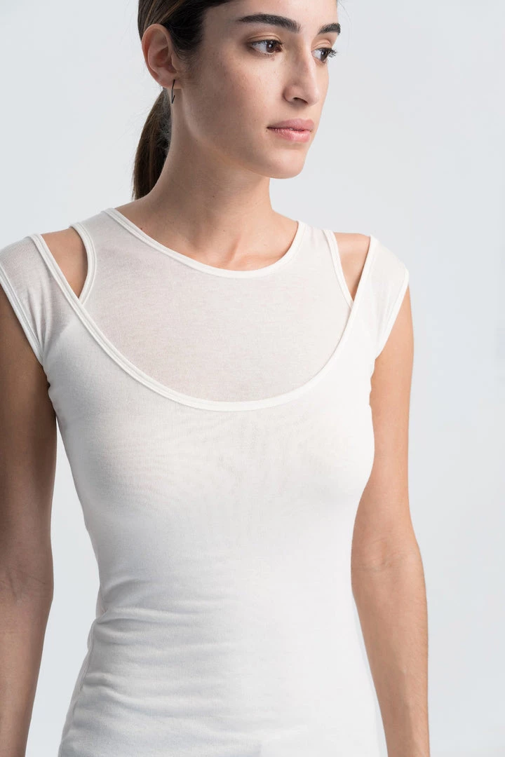 Using cutouts to accentuate your shoulders and neckline is one of our favorite design elements. This lovely sleeveless top features two layers of sheer jersey to create a tulip-like shape that will elevate your look whether you wear it with jeans out on the town or a pencil skirt for a more formal event. [SPLIT]