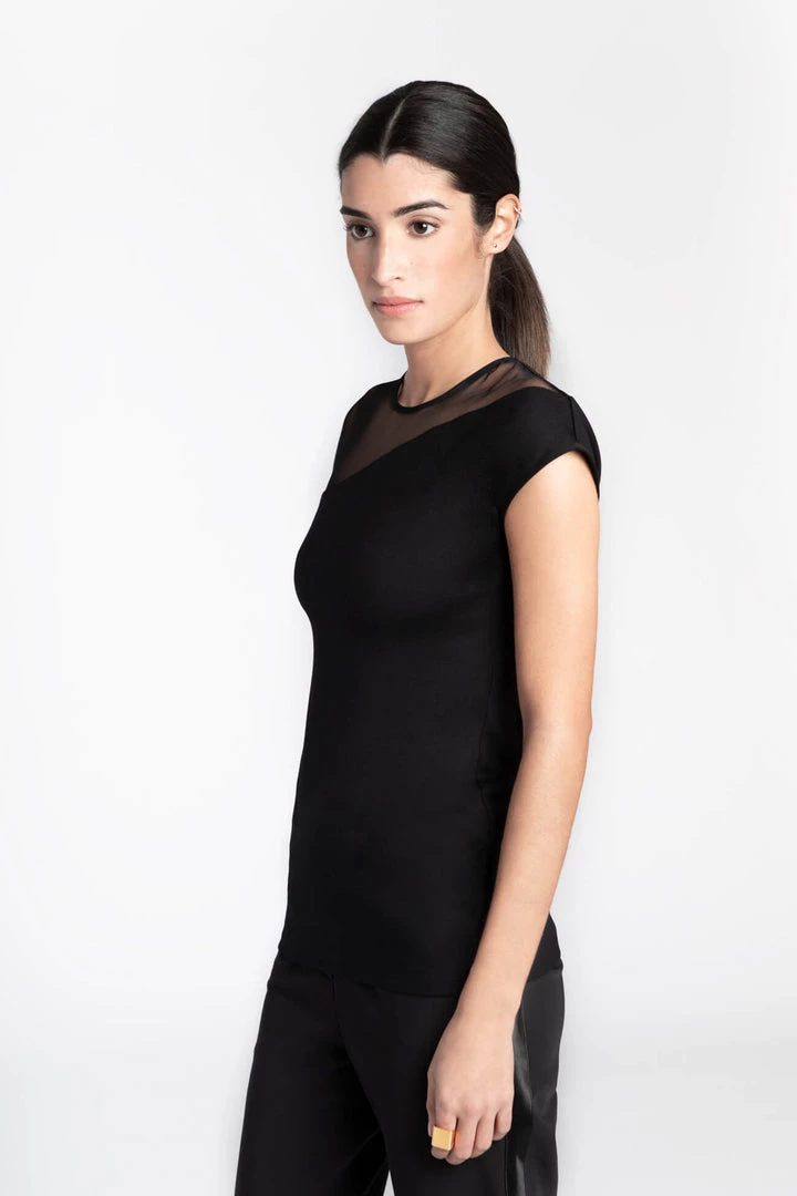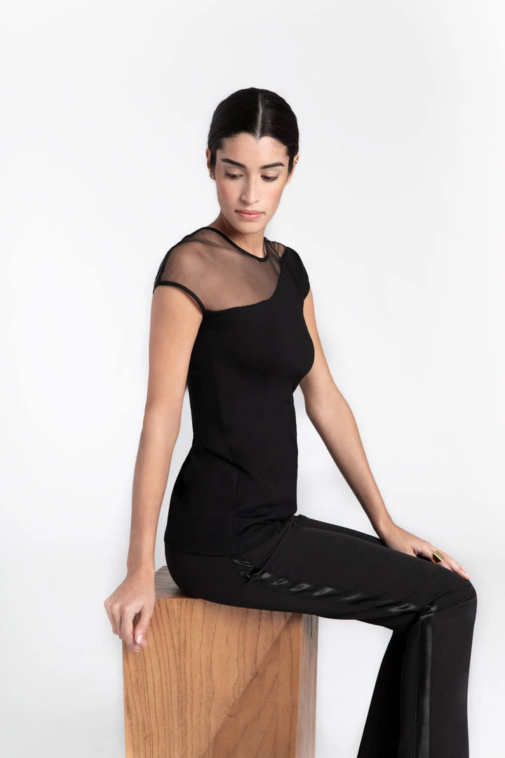 A multi-faceted ode to femininity, Florence is a cap-sleeve top fashioned from our mid-stretch European ponte fabric but laced with edge, thanks to the slant of European mesh across the decolletage. Her magic? She can look as relaxed or refined as you want with a simple swap of accessories.