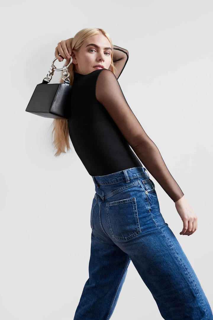 Meet Hollis, the epitome of day-to-night edge. She’s a classic long sleeve mockneck blouse with sheer sleeves in European mesh. A contrasting seam travels up each arm. Hollis is crafted from soft, sustainable European jersey for that perfectly hugging fit, ideal for work to cocktails and everything in between. [SPLIT]