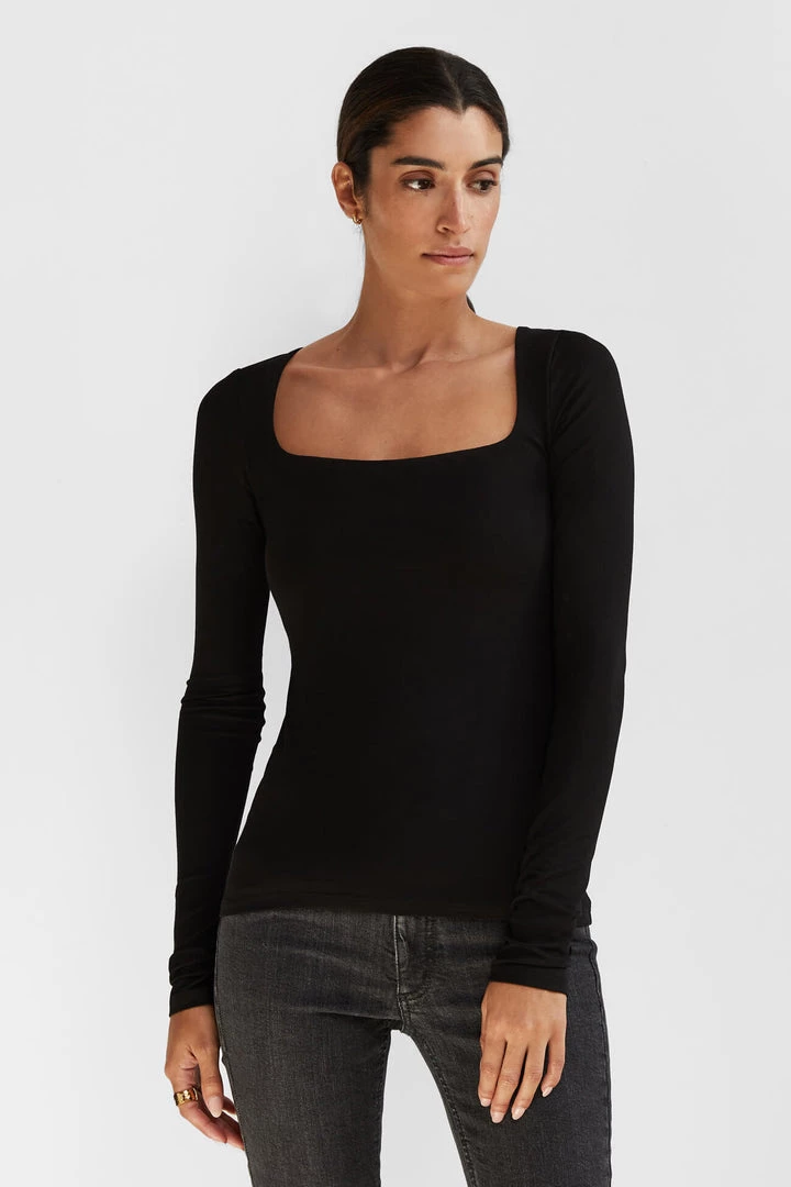 Meet Yvonne, our do-it-all top appropriate for any occasion. She features a hypnotic square neckline and long sleeves for that edgy touch, with a double layer of our silky, high-stretch and sustainable European jersey lining the chest area providing additional support. Sexy and sophisticated at once, Yvonne’s ready to tag along for anything. [SPLIT]